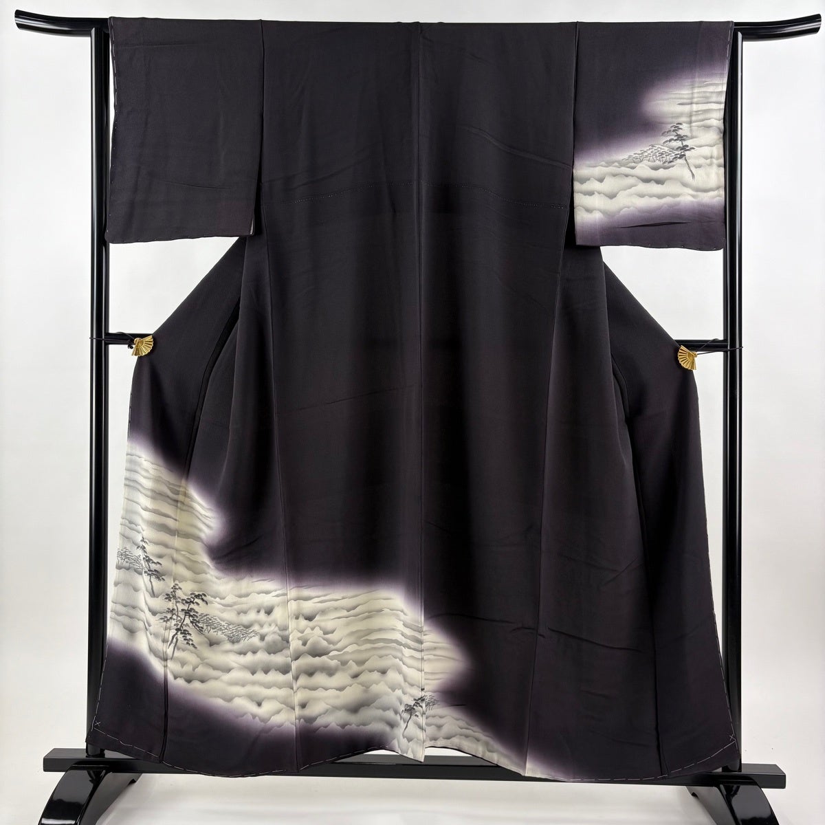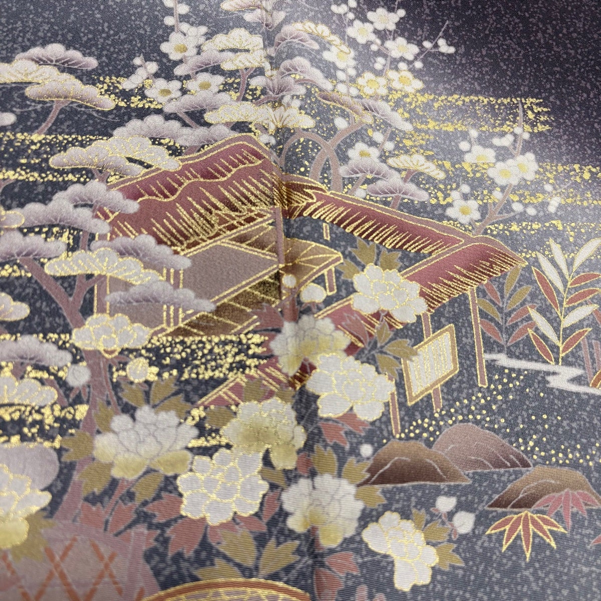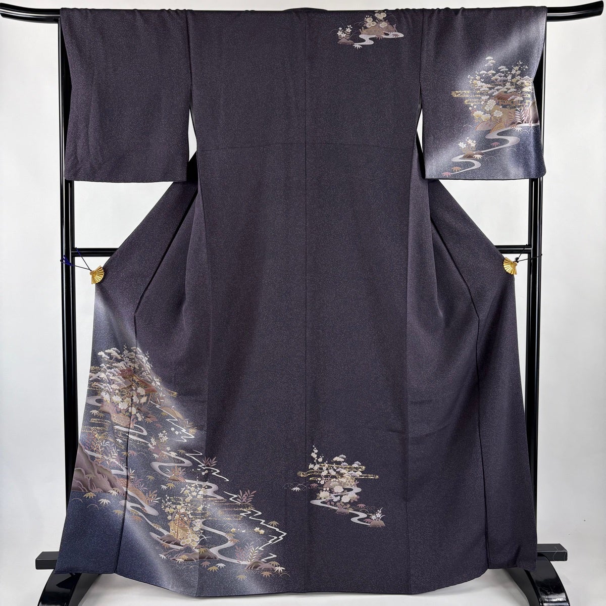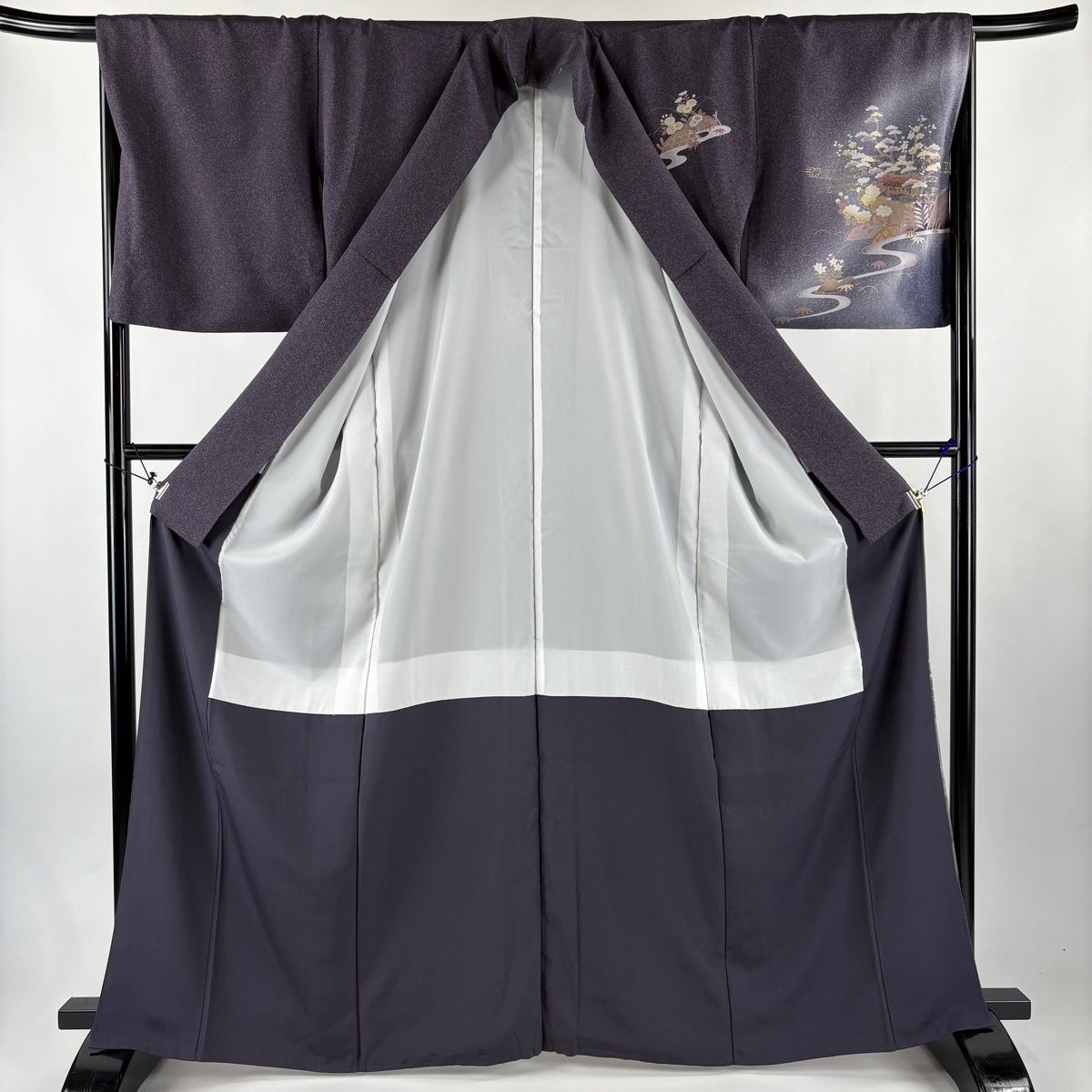 付下げ 身丈165cm 裄丈67cm M 袷 家屋 松竹梅 金彩 ぼかし 濃紫 正絹 秀品