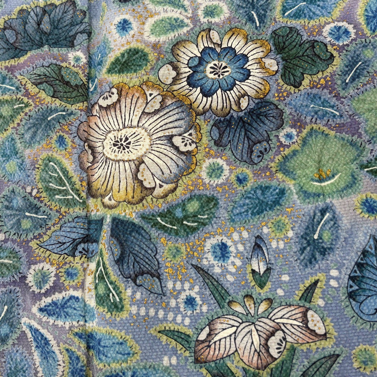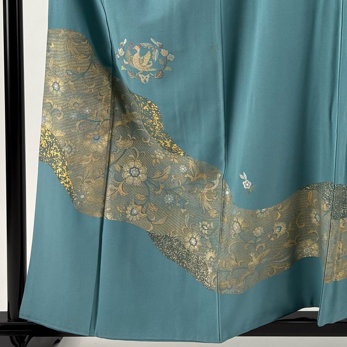 付下げ 身丈159cm 裄丈67cm M 袷 草花 鳥 箔 金彩 青緑 正絹 秀品 一つ紋