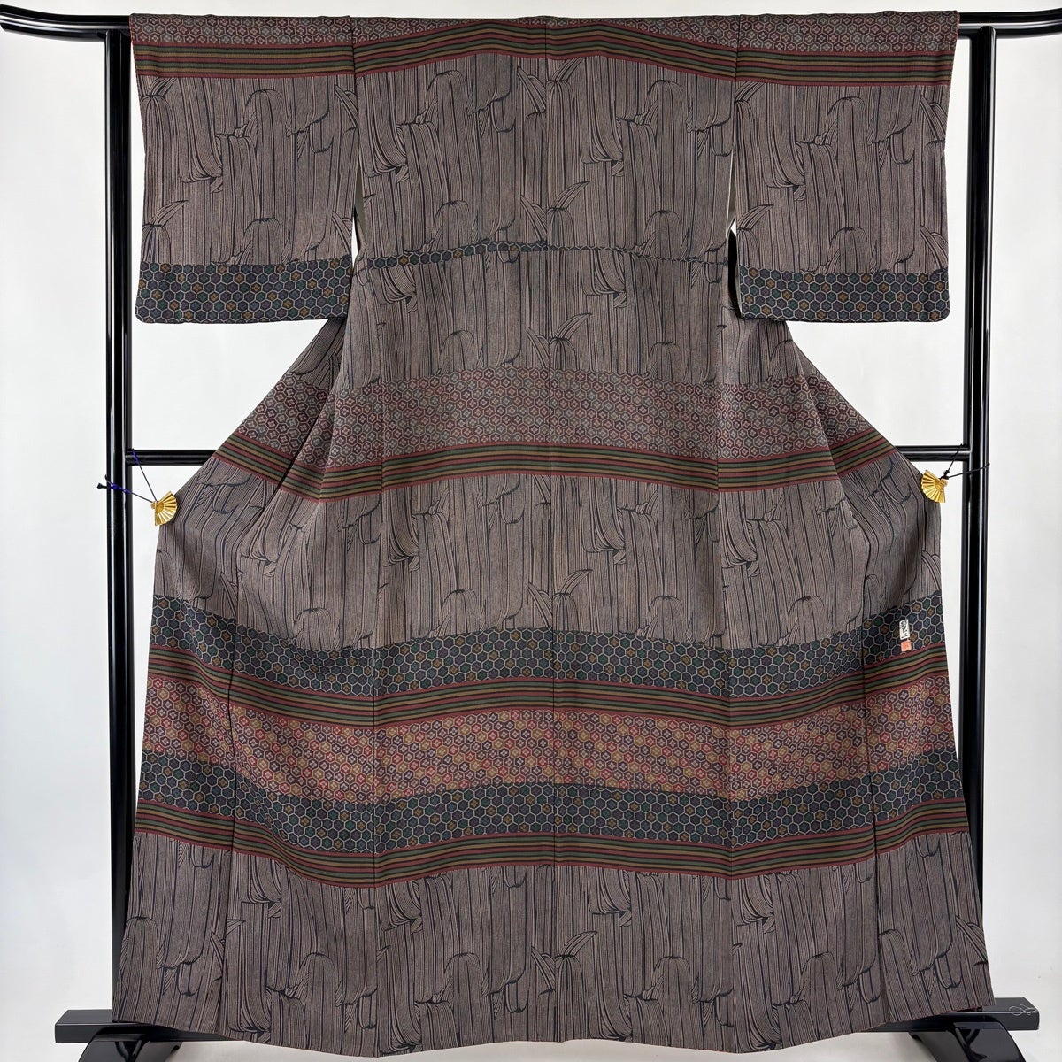 訪問着 身丈160cm 裄丈62cm S 袷 落款あり 亀甲 縞 縮緬 焦茶色 正絹 秀品