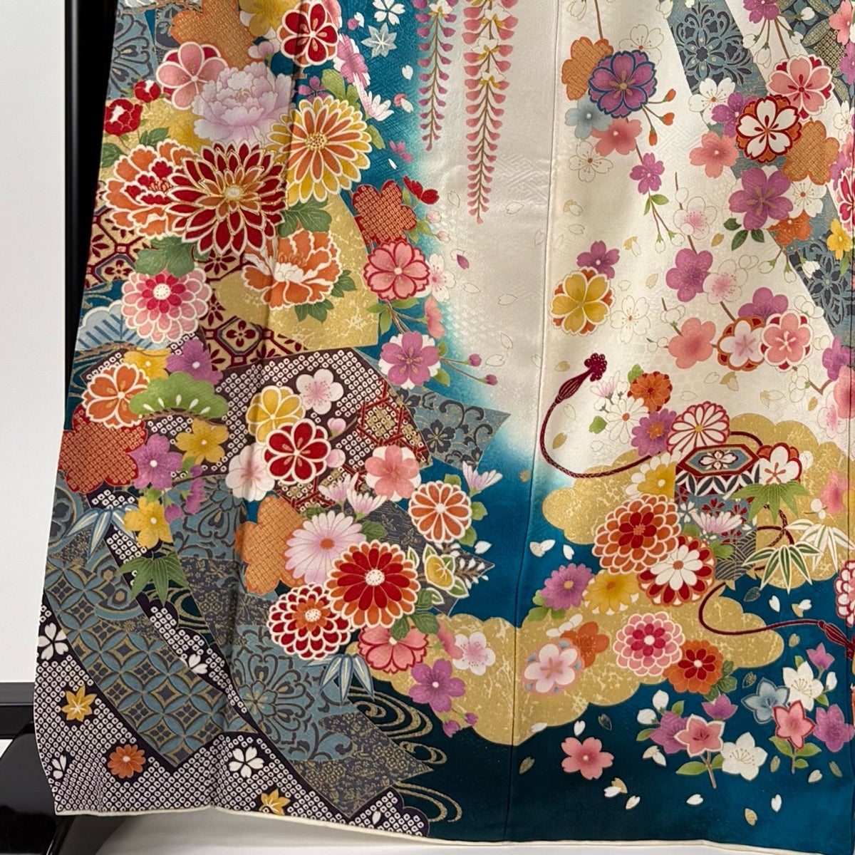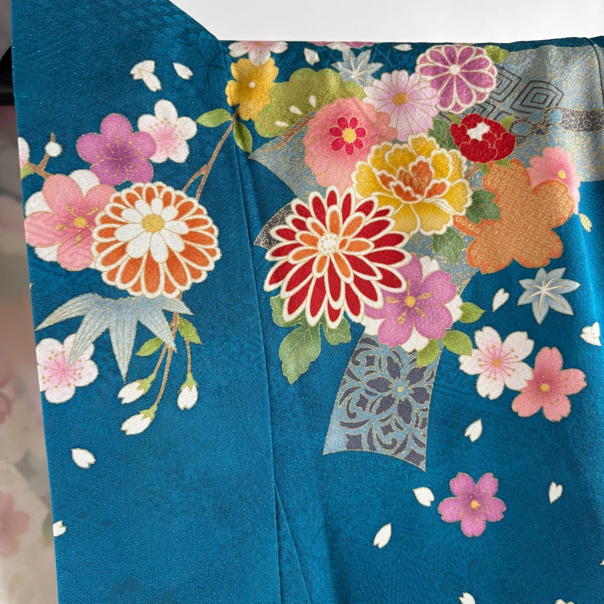 振袖 身丈168.5cm 裄丈66cm M 袷 菊 松竹梅 銀通し 金糸 青緑 正絹 逸品