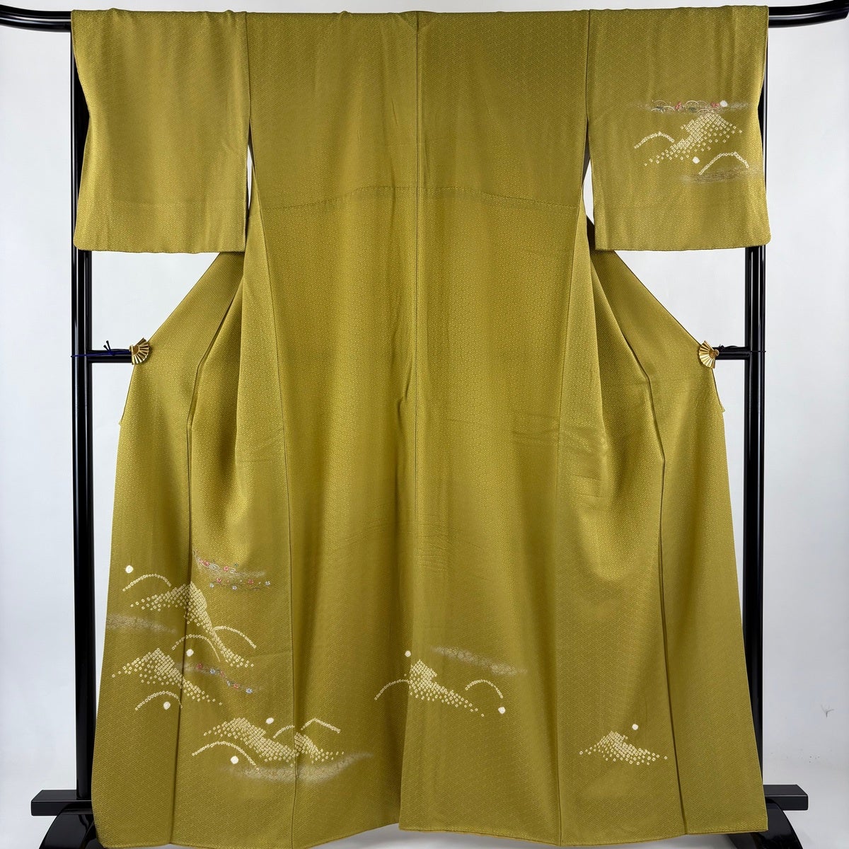 付下げ 身丈162.5cm 裄丈67.5cm L 袷 芝 鴛鴦 刺繍 絞り 黄土色 正絹 秀品