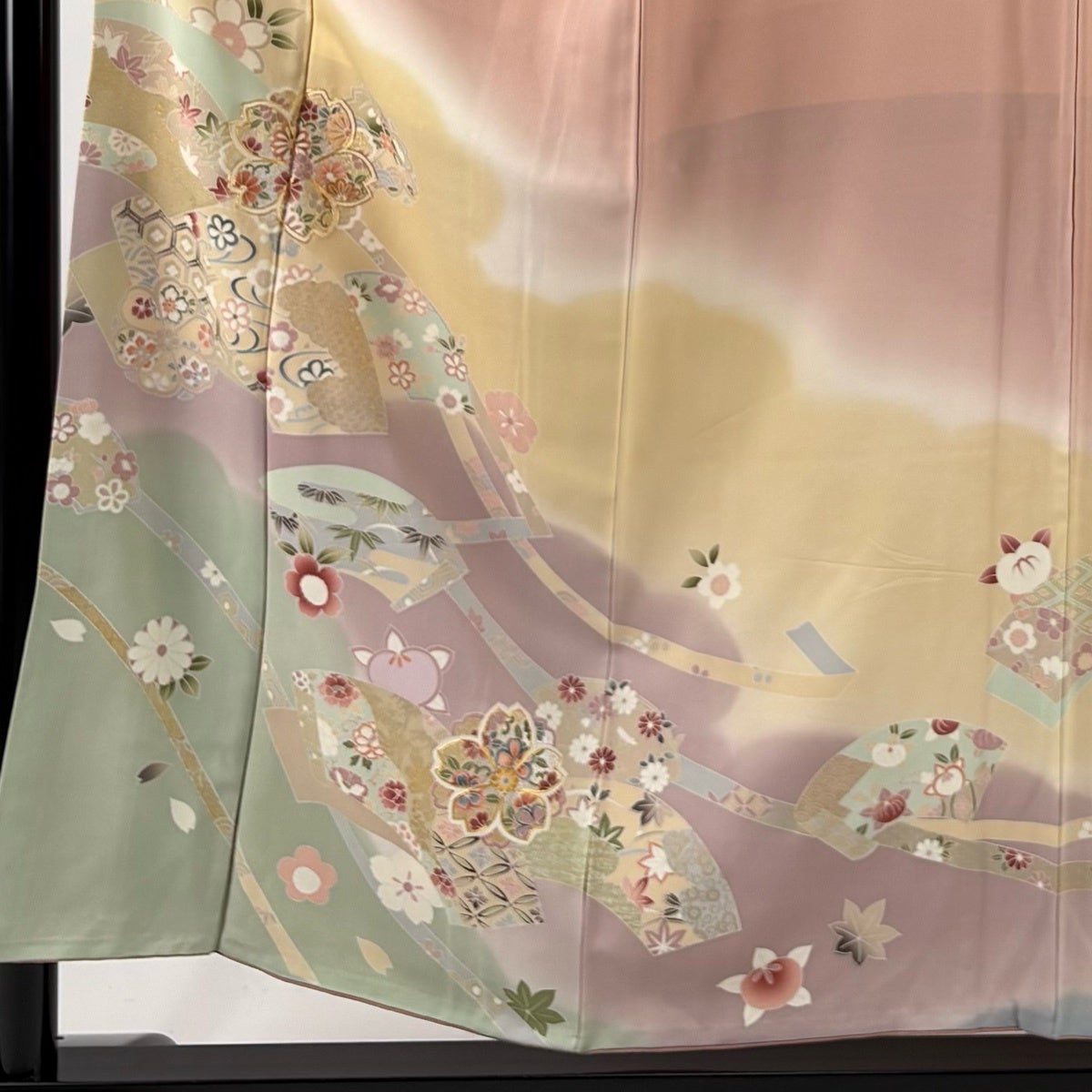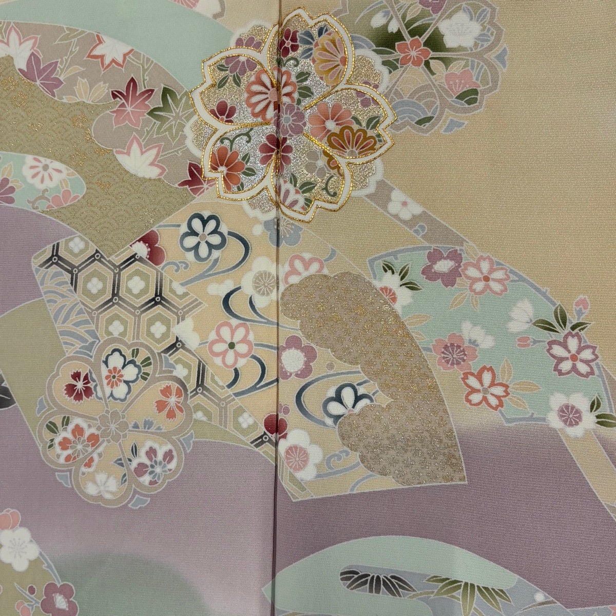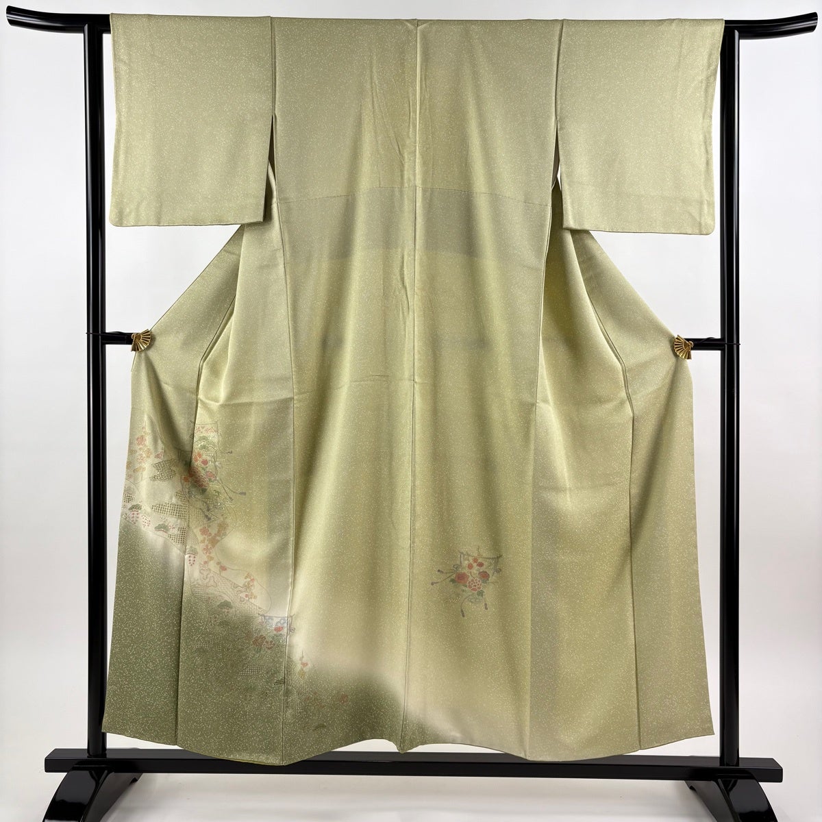 付下げ 身丈165.5cm 裄丈67cm M 袷 扇面 草花 金彩 ぼかし 緑 正絹 秀品
