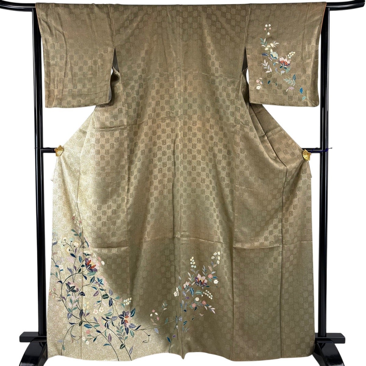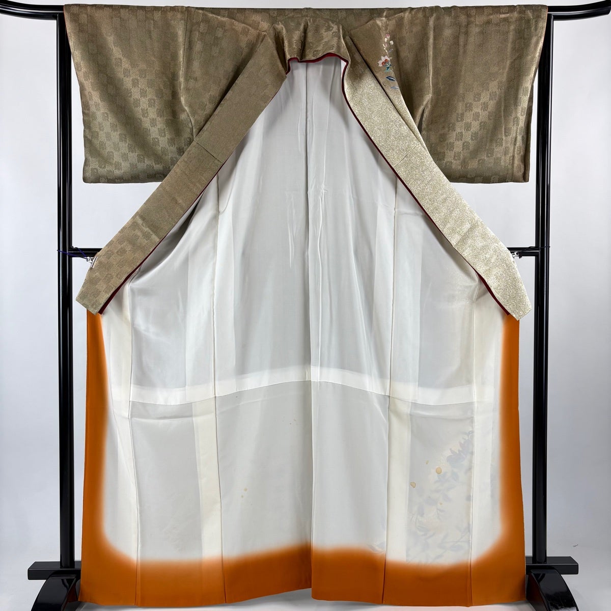 付下げ 身丈166.5cm 裄丈65cm M 袷 草花 地紋 金彩 染分け 薄茶色 正絹 優品