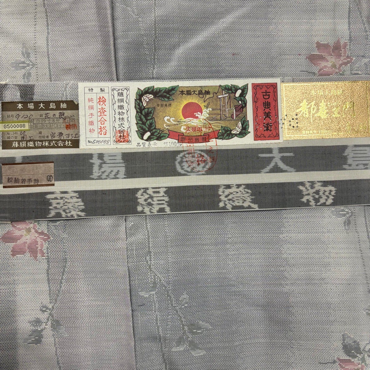 大島紬 身丈157cm 裄丈63cm S 袷 都喜ヱ門 証紙あり 草花 縞 灰紫 正絹 逸品