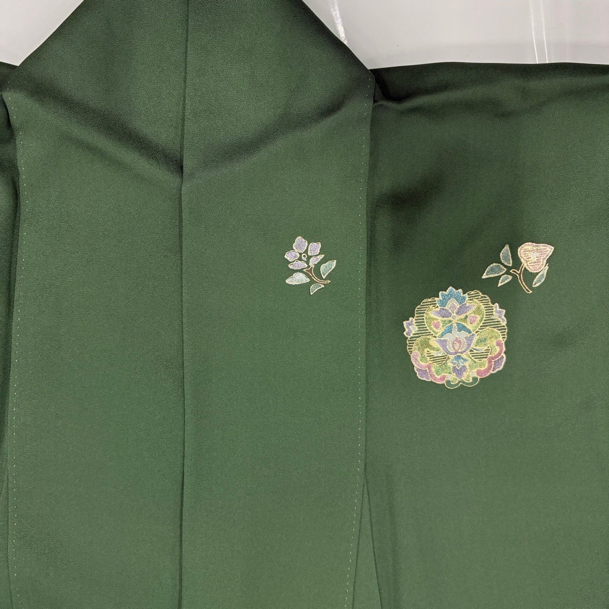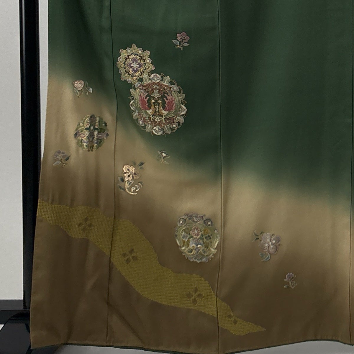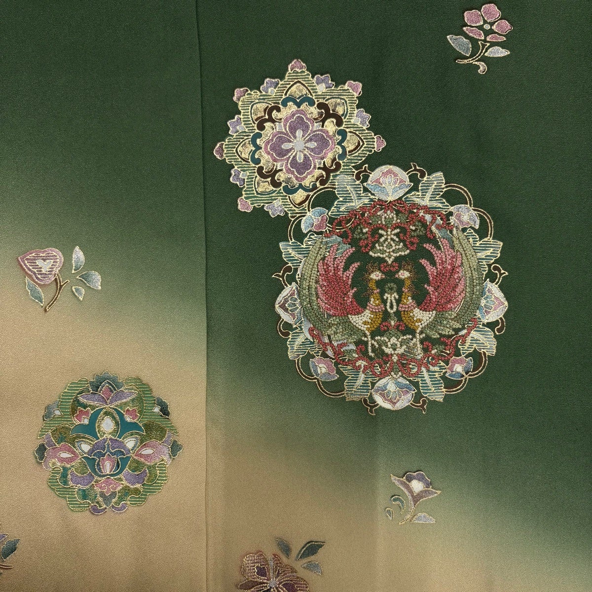付下げ 身丈165cm 裄丈67cm M 袷 華文 向かい鳥 刺繍 金銀彩 深緑 正絹 秀品
