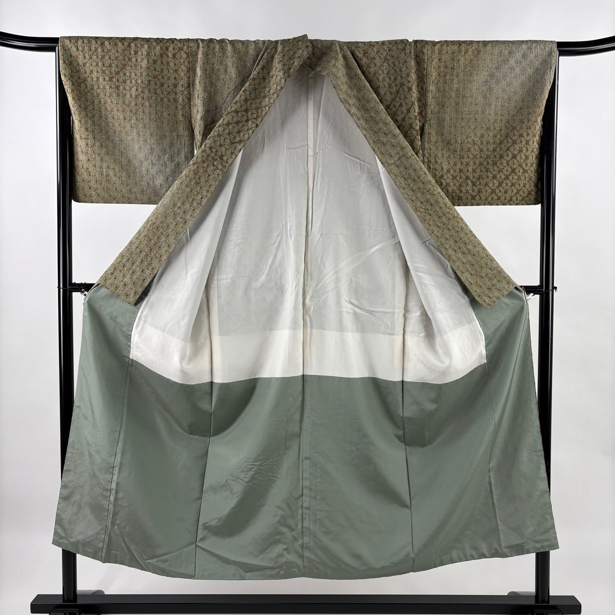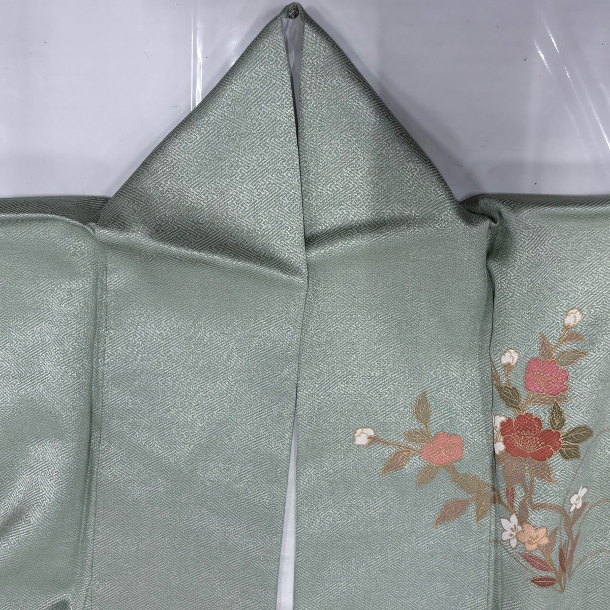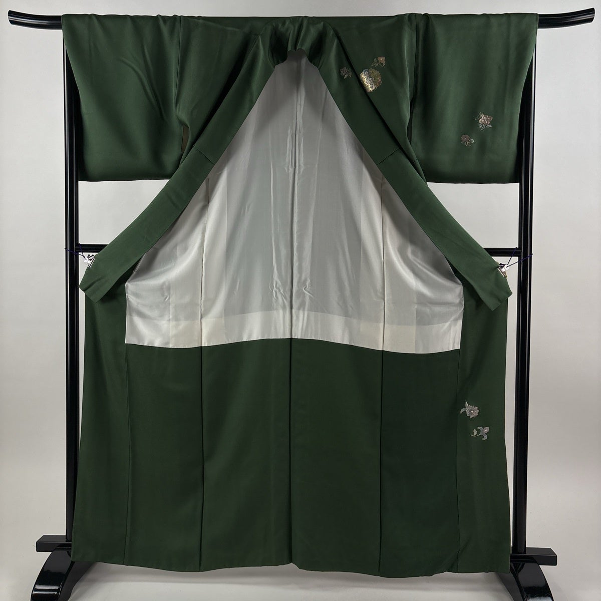 付下げ 身丈165cm 裄丈67cm M 袷 華文 向かい鳥 刺繍 金銀彩 深緑 正絹 秀品