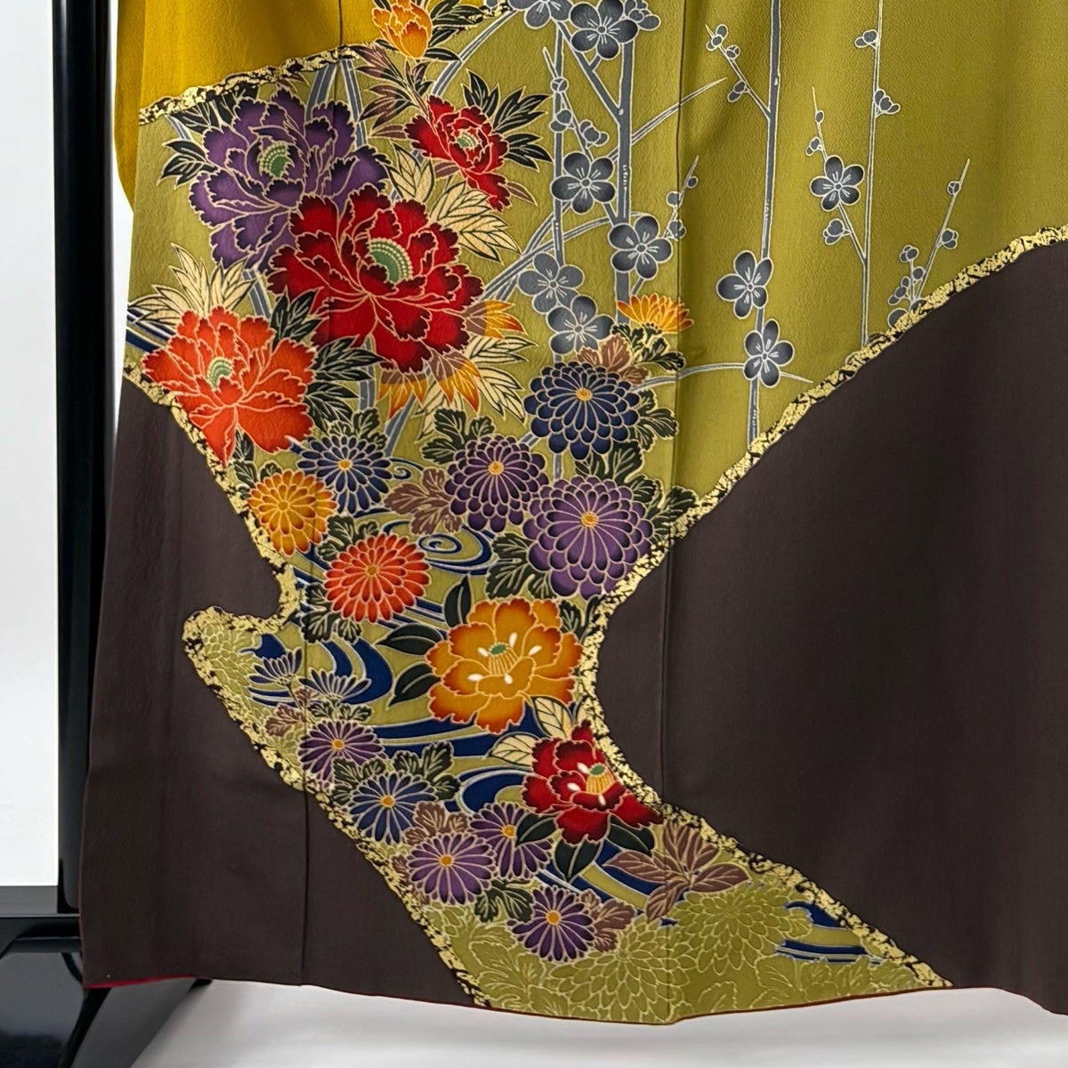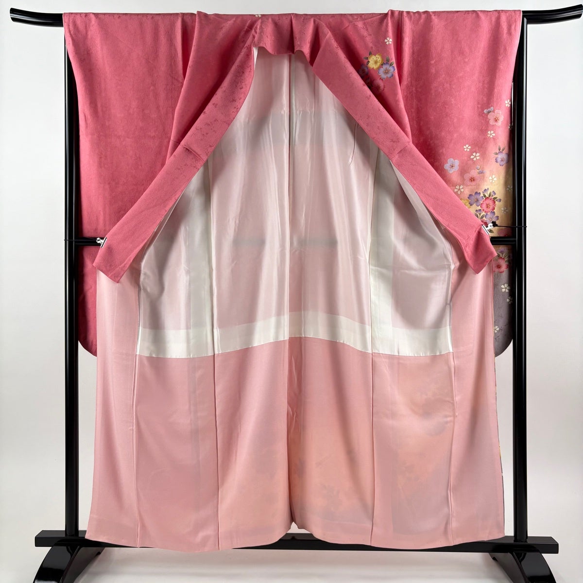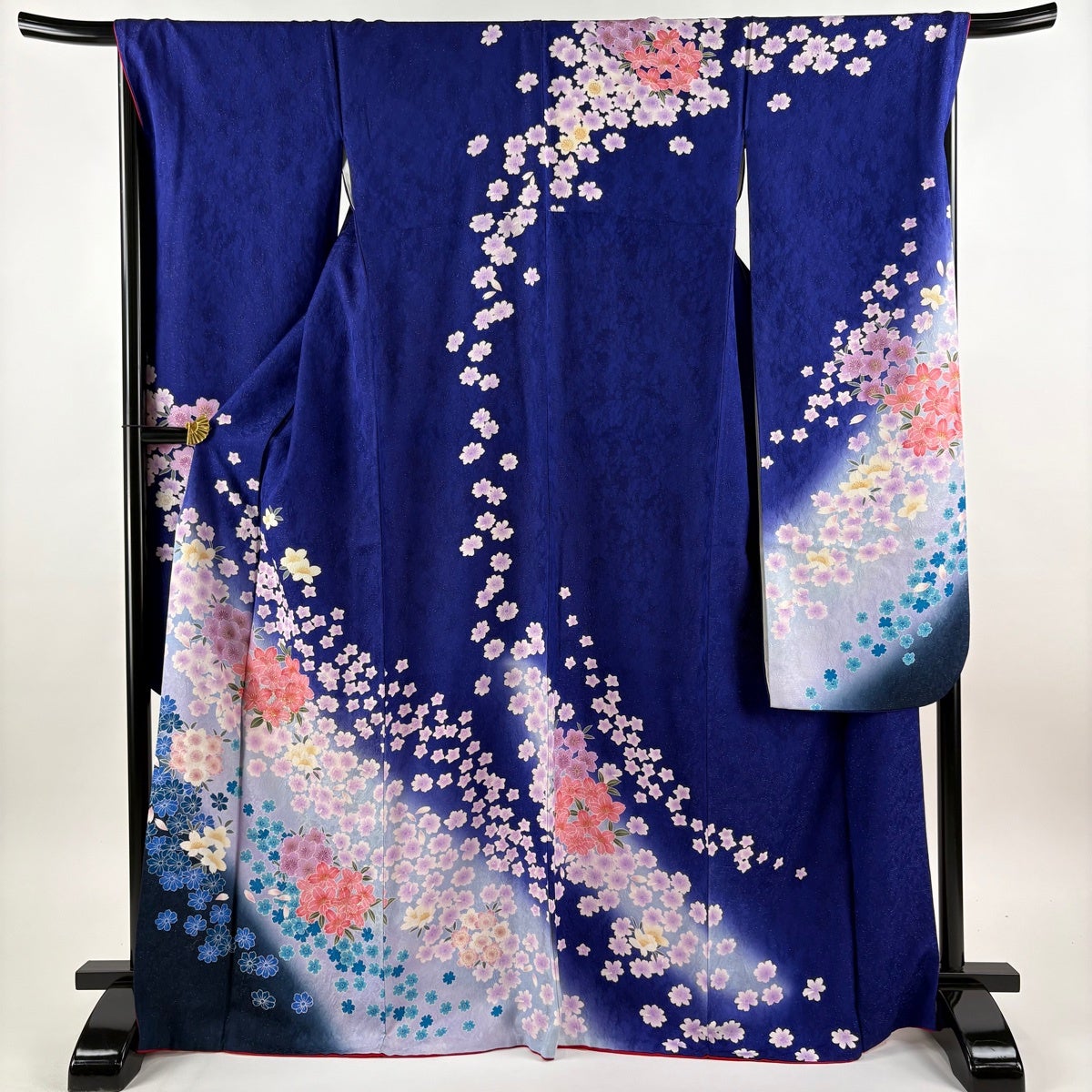 【美品】 振袖 身丈160cm 裄丈64cm M 袷 桜 菊 刺繍 染め分け 黒 正絹 名品