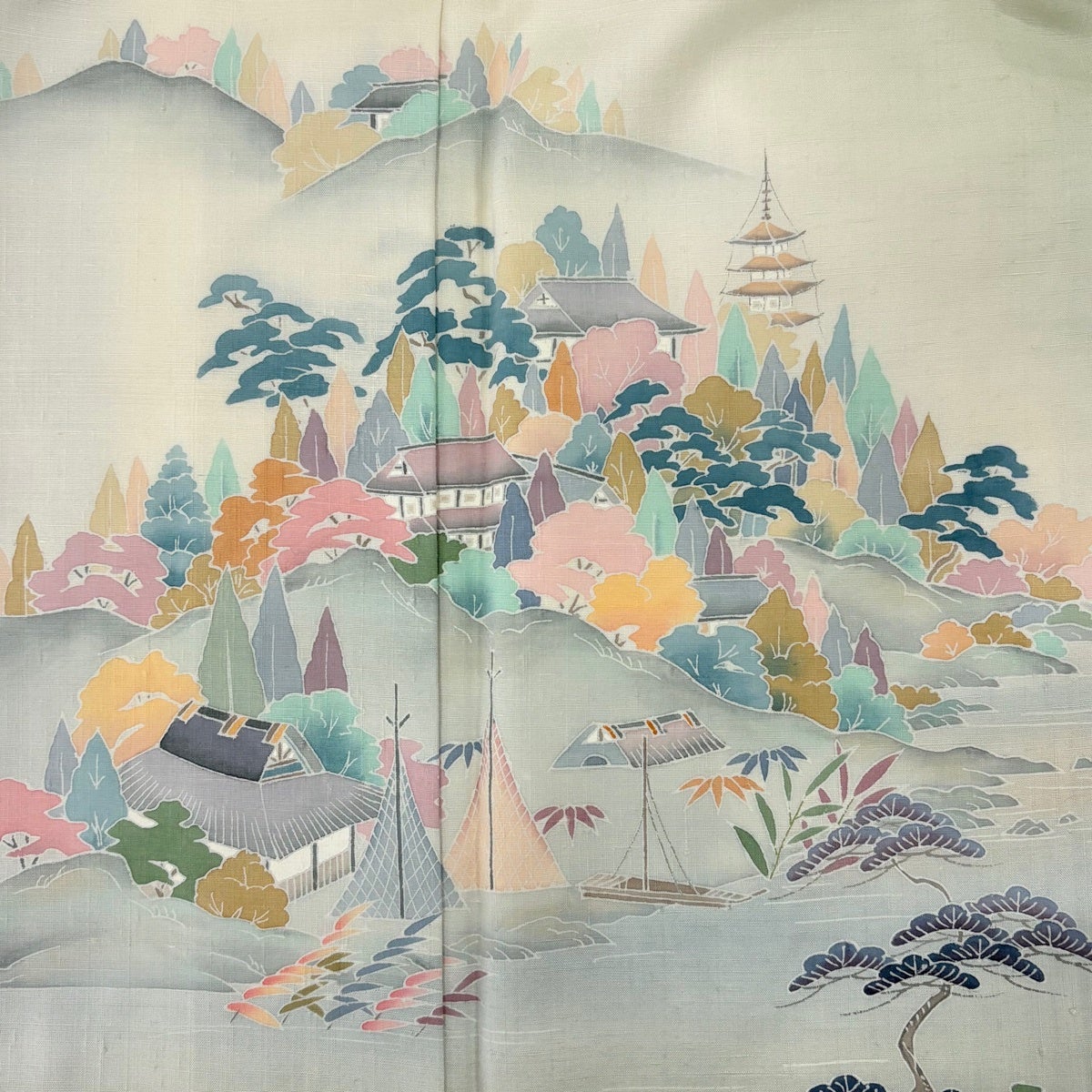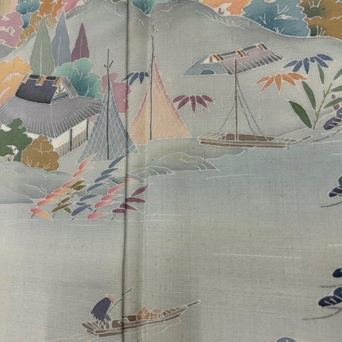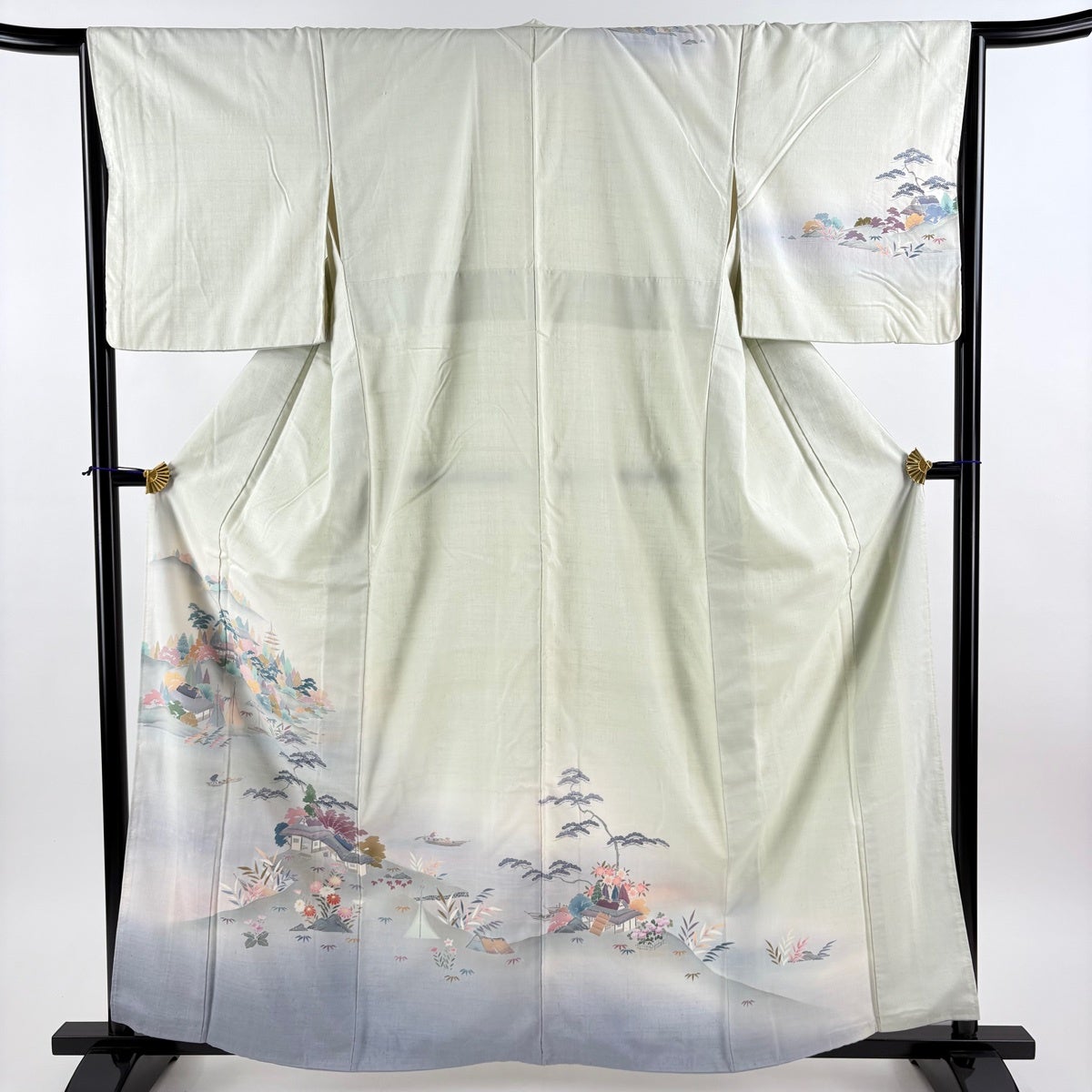訪問着 身丈162cm 裄丈66cm M 袷 紬地 水辺の風景 舟 ぼかし 薄緑 正絹 秀品