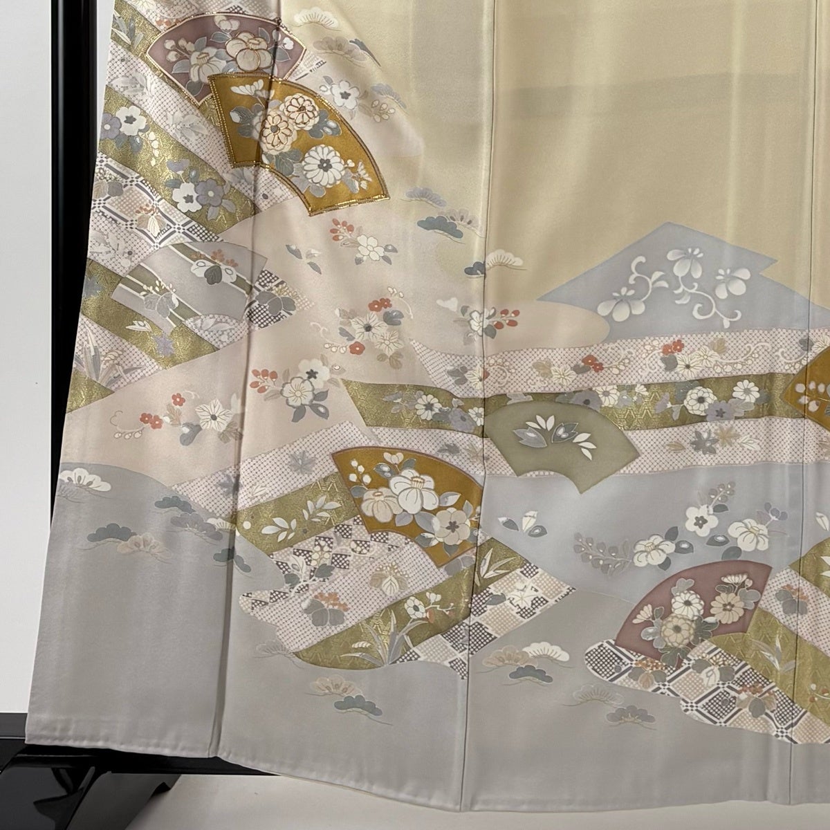 訪問着 身丈163cm 裄丈67cm M 袷 団扇 姫 金糸 金彩 灰色 正絹 秀品