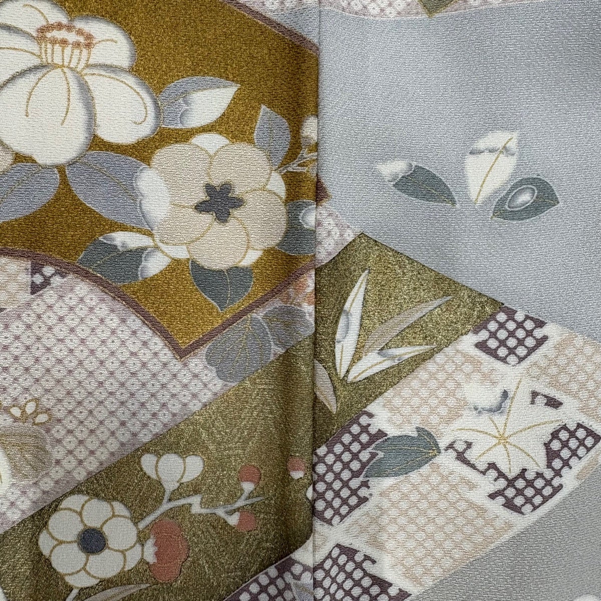 訪問着 身丈169cm 裄丈67cm M 袷 椿 葉 金糸 刺繍 青灰色 正絹 優品 一つ紋