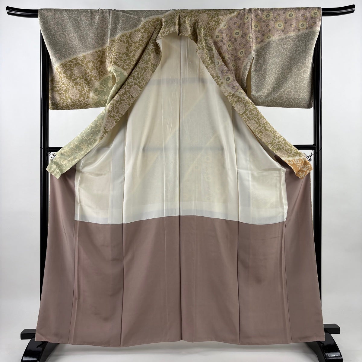 訪問着 身丈156cm 裄丈66cm M 袷 落款あり 枝花 ぼかし 灰緑 正絹 秀品 一つ紋