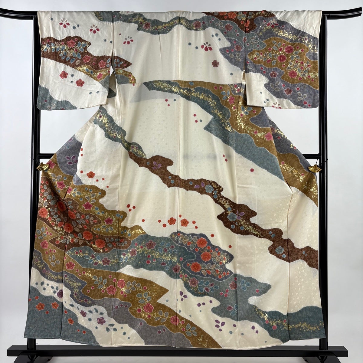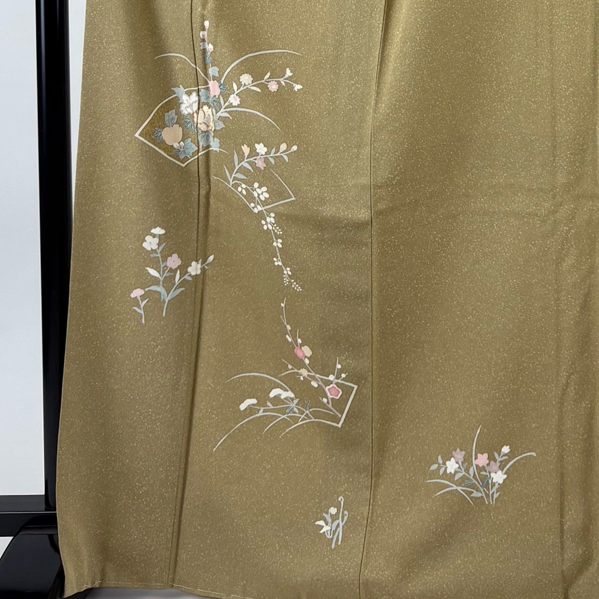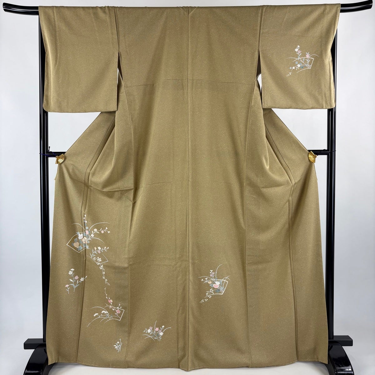 訪問着 身丈162cm 裄丈64cm M 袷 扇面 草花 金糸 金彩 ベージュ 正絹 秀品