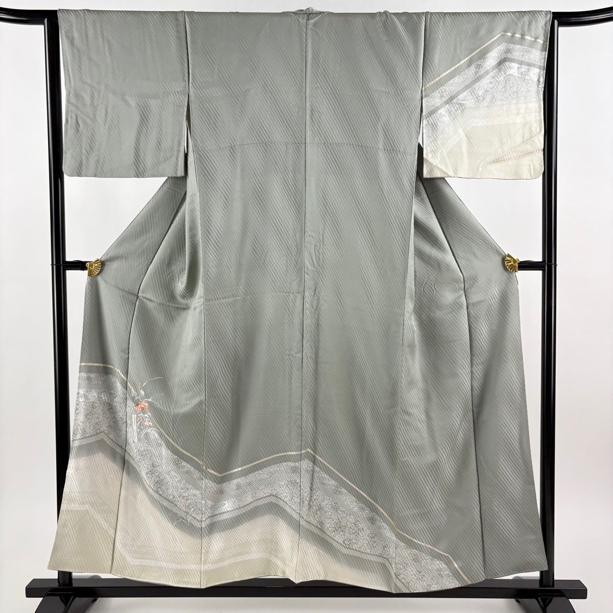 付下げ 身丈166cm 裄丈69cm L 袷 草花 観世水 刺繍 青灰色 正絹 秀品