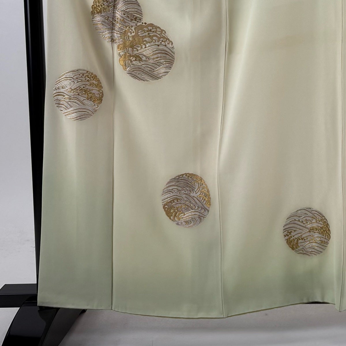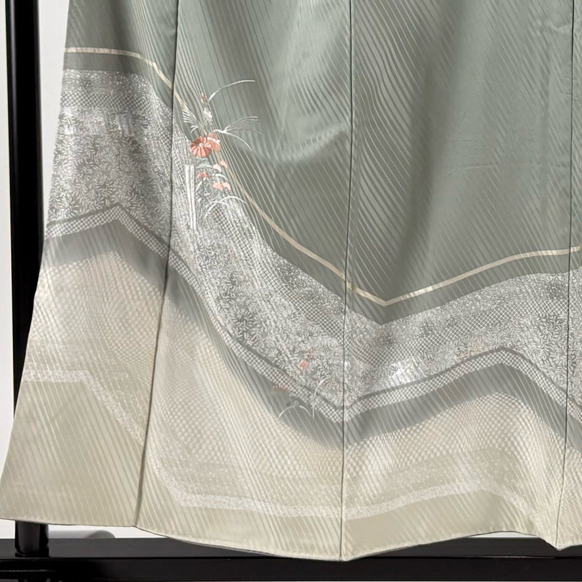 付下げ 身丈165.5cm 裄丈65cm M 袷 菊 梅 刺繍 金糸 薄緑 正絹 秀品