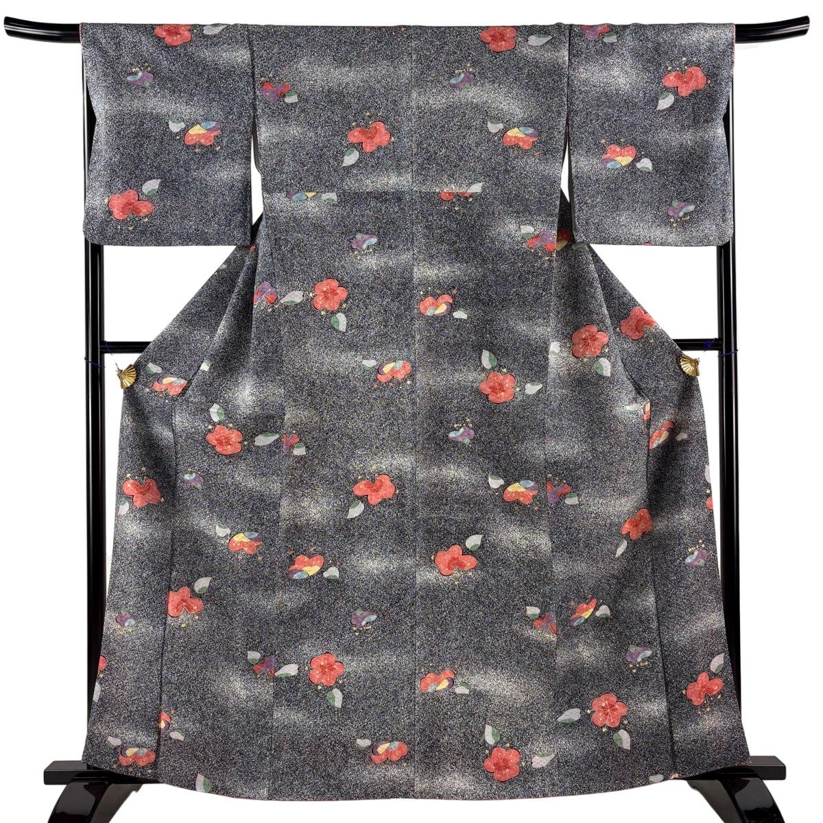 【美品】 男着物 身丈148cm 裄丈67.5cm L 袷 亀甲絣 黒灰 正絹 秀品