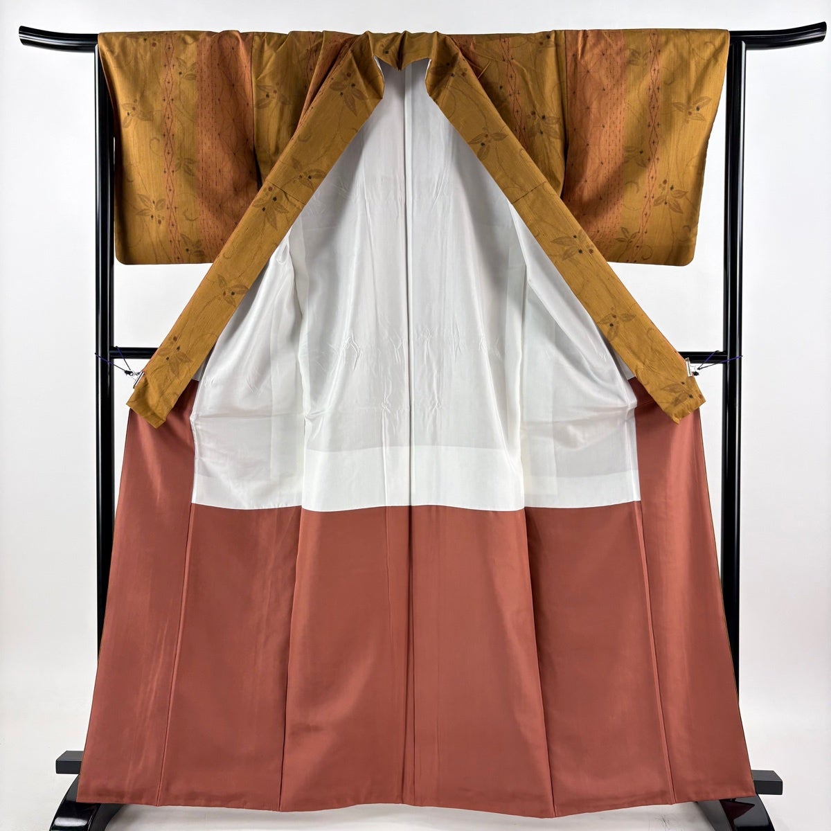 訪問着 身丈155cm 裄丈65cm M 袷 紬地 草花 波 絞り 黄土色 正絹 名品