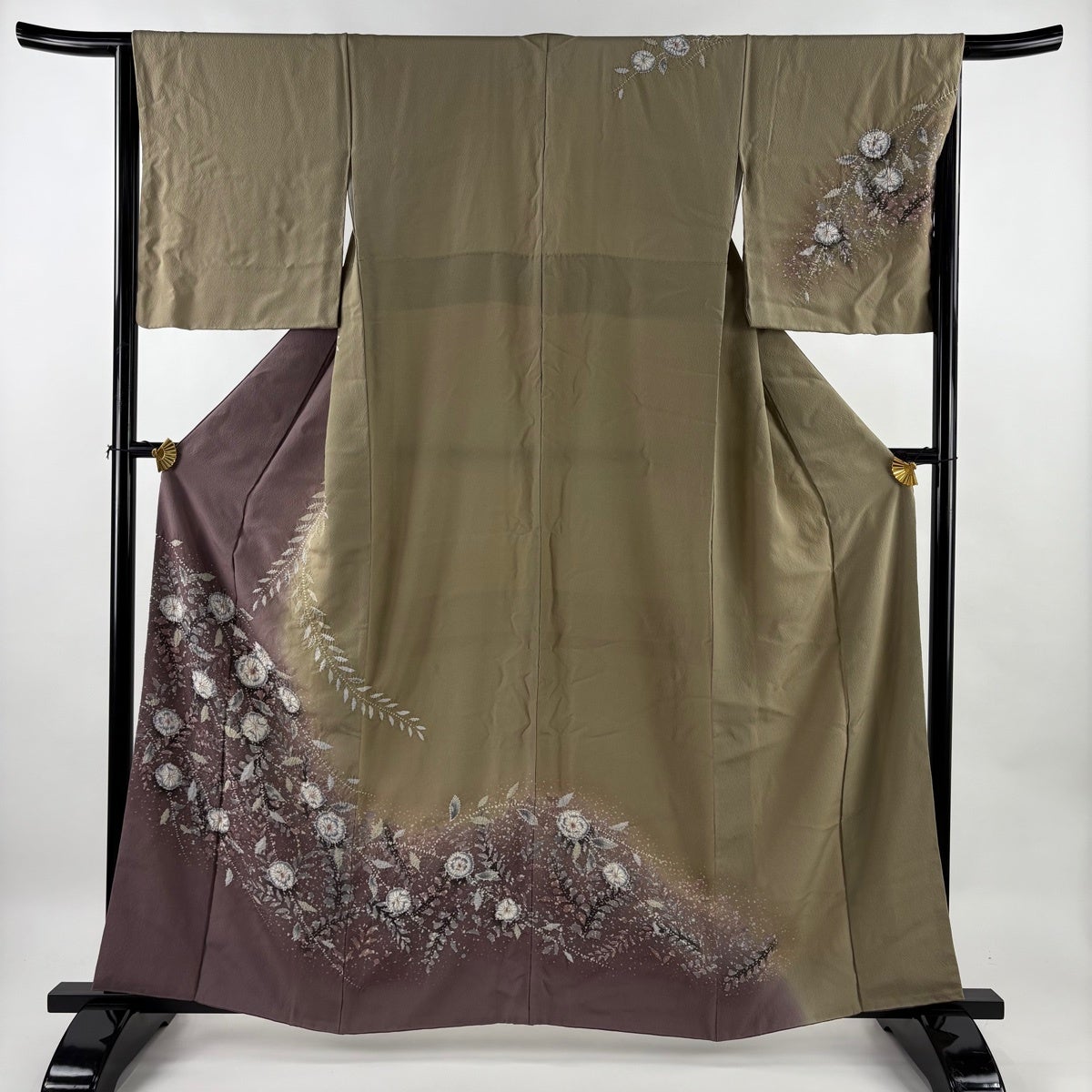 付下げ 身丈163cm 裄丈65cm M 袷 南克治 落款あり 枝花 ぼかし 灰緑 正絹 秀品