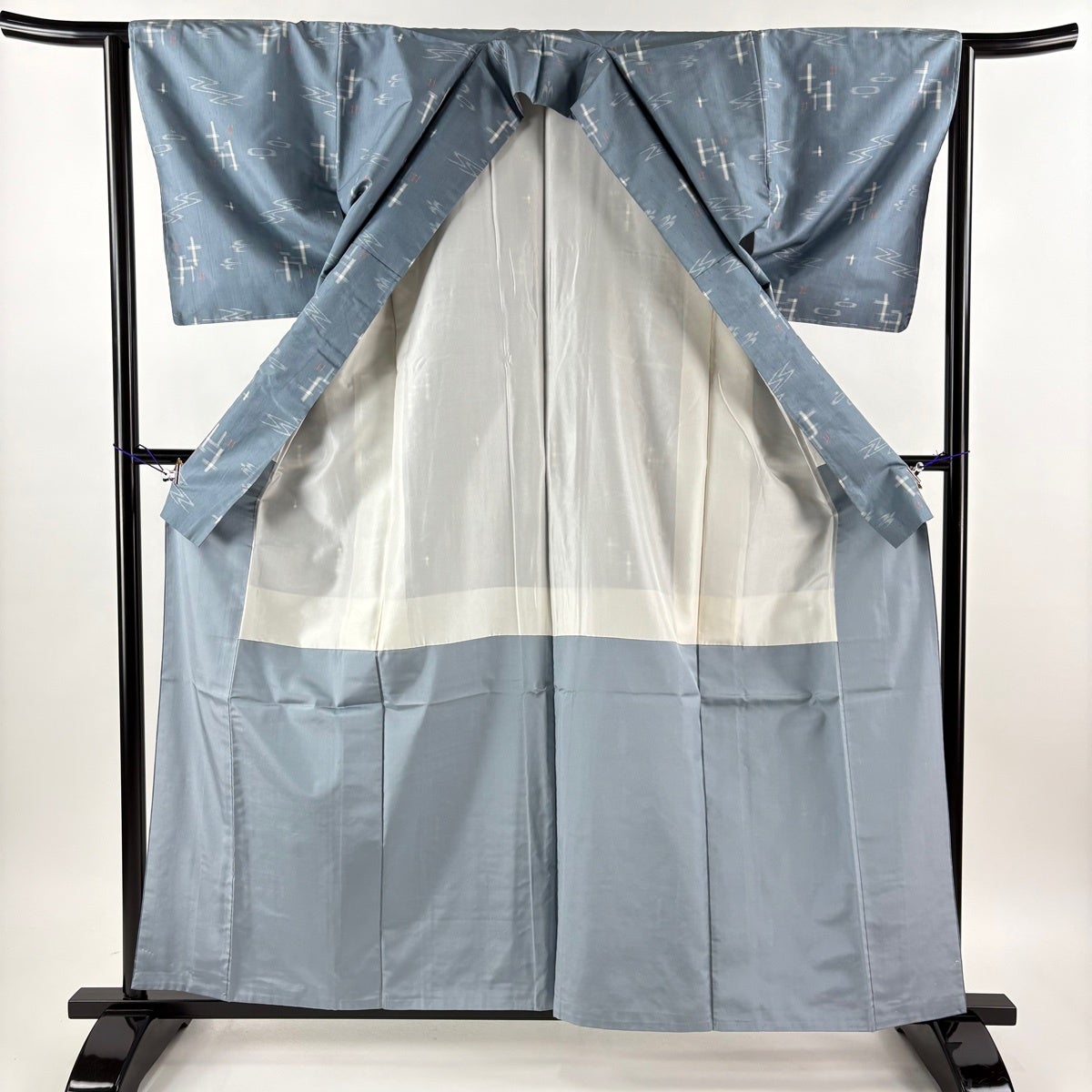 紬 身丈163.5cm 裄丈62.5cm S 袷 横縞 青灰色 正絹 秀品