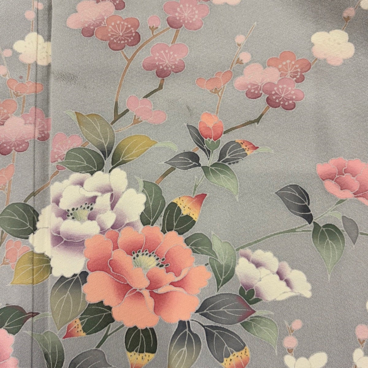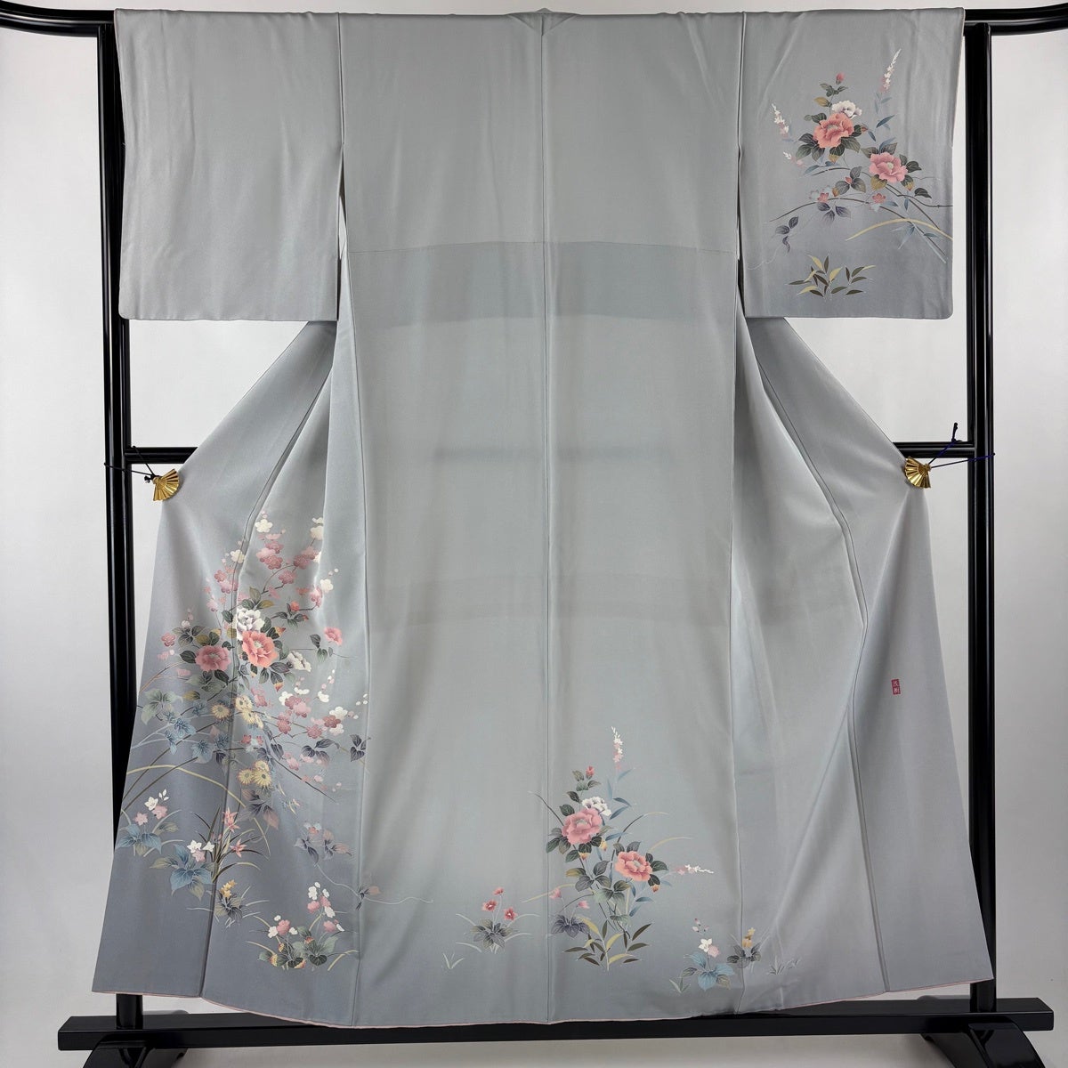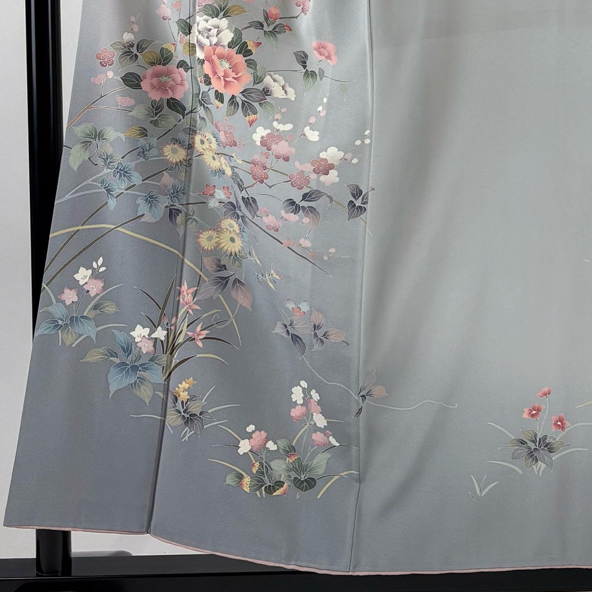 付下げ 身丈167cm 裄丈64.5cm M 袷 童 草花 灰色 正絹 秀品 一つ紋