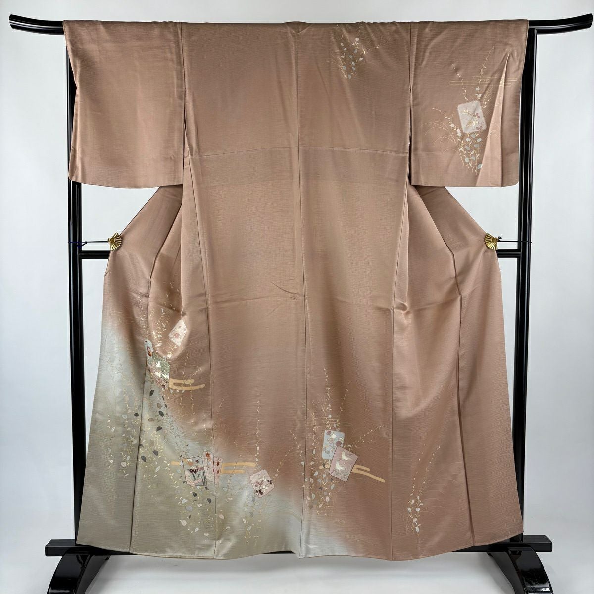 付下げ 身丈161cm 裄丈63.5cm S 袷 扇面 草花 刺繍 茶色 正絹 秀品