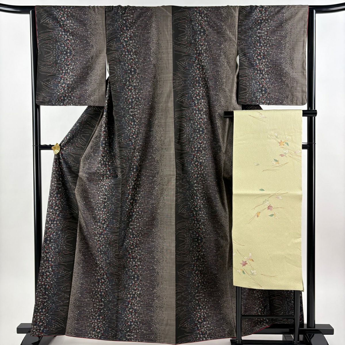 【美品】 紬 身丈159.5cm 裄丈63cm S 袷 草花 ヱ霞 墨色 正絹 秀品