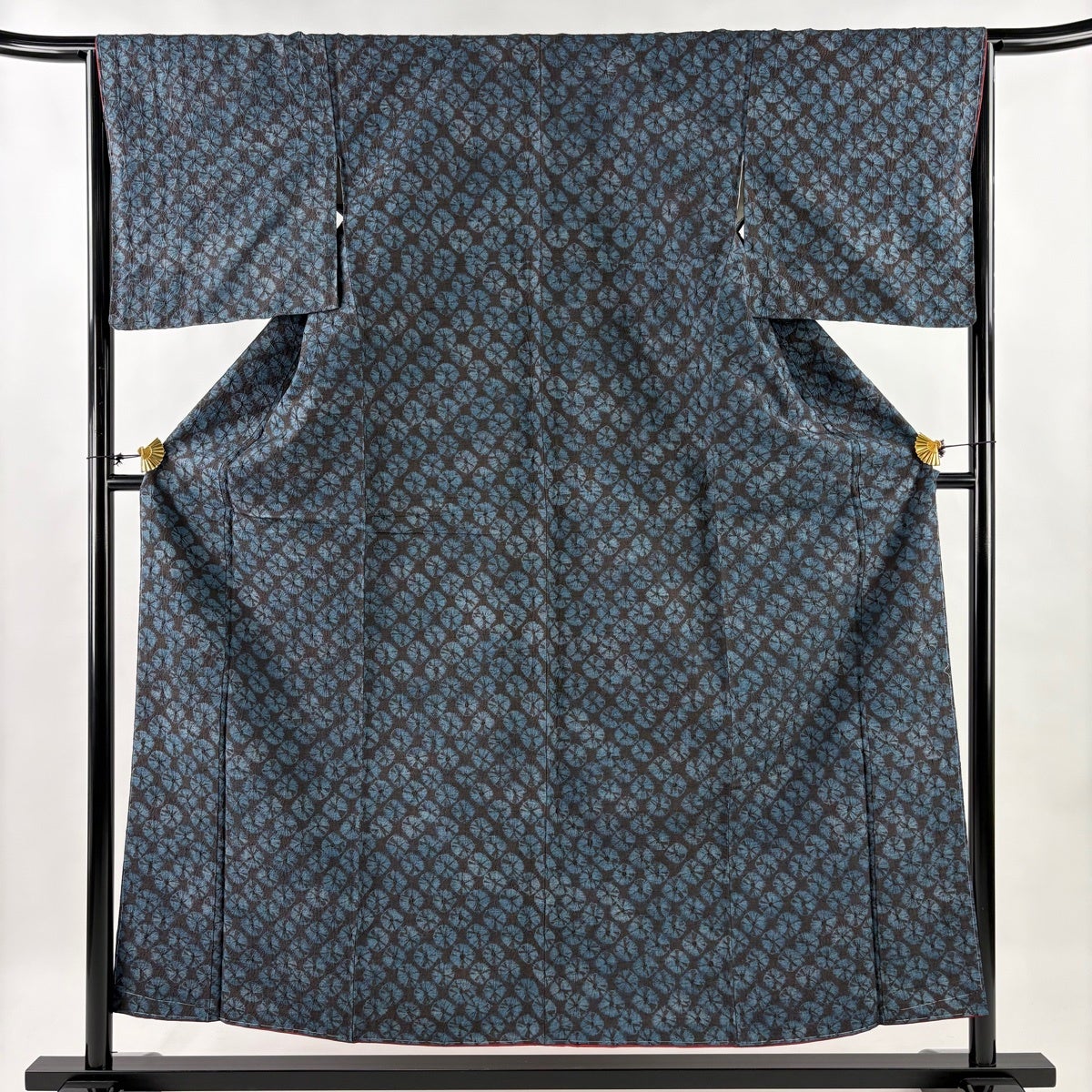 【美品】 紬 身丈163.5cm 裄丈64.5cm M 袷 草花 流水 焦茶色 正絹 秀品