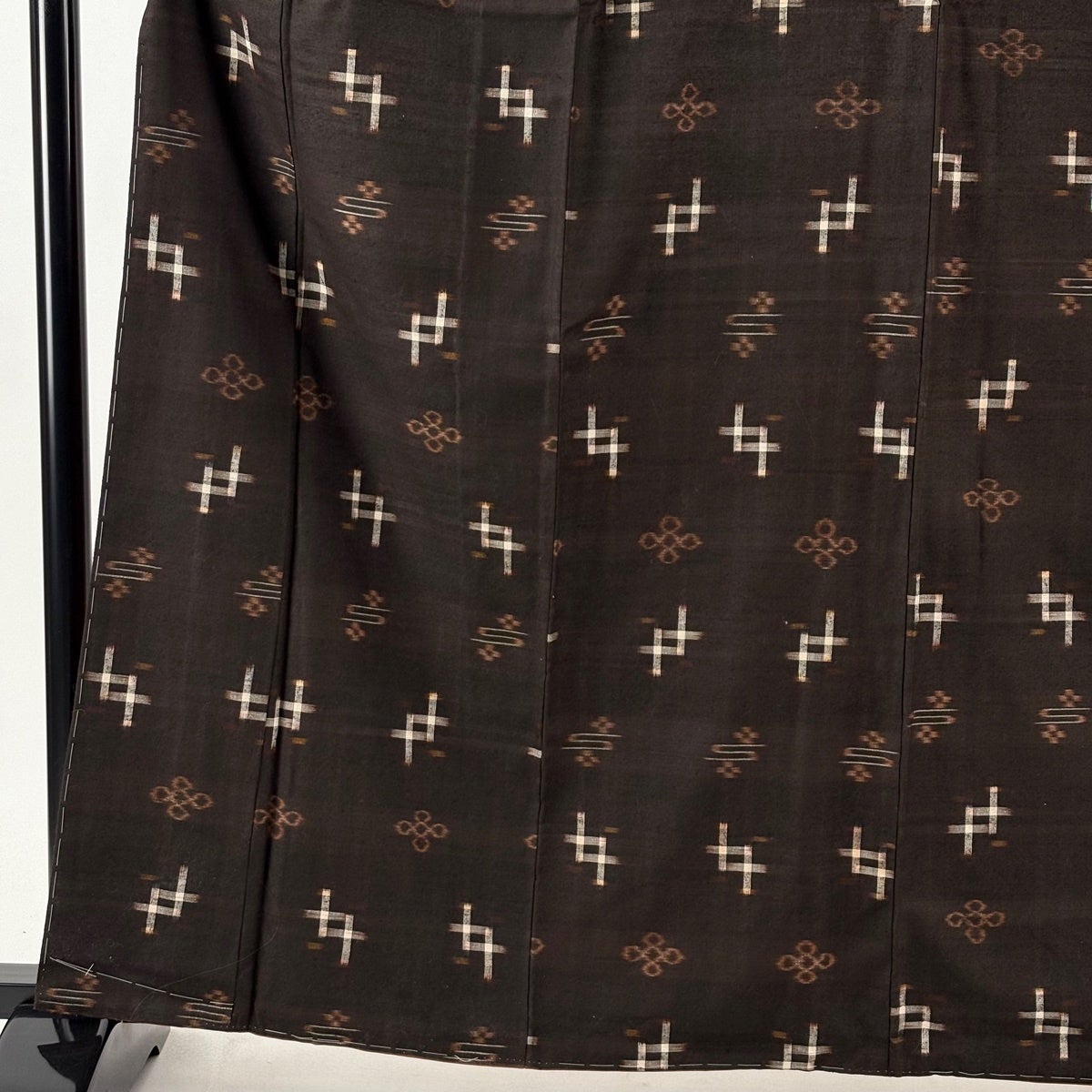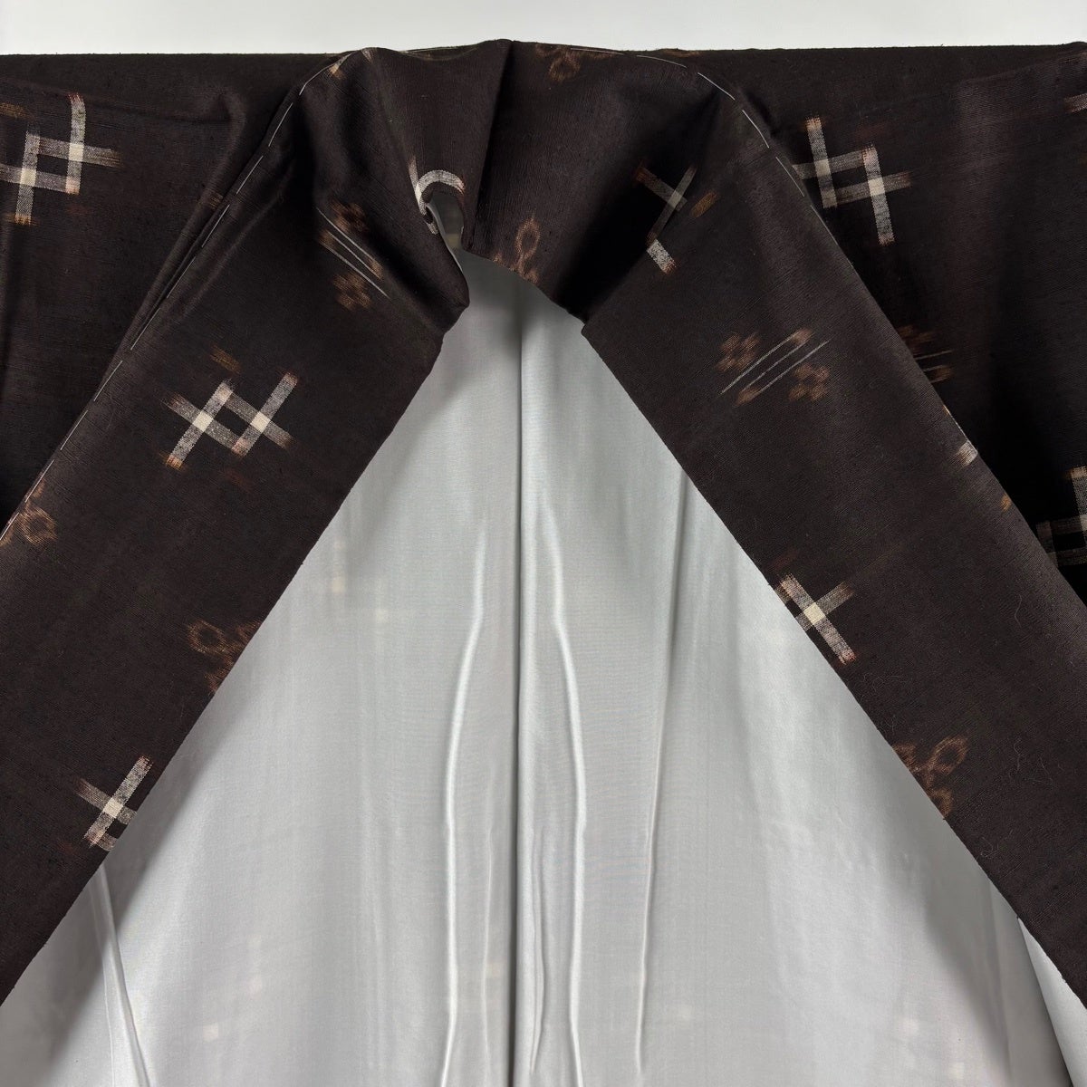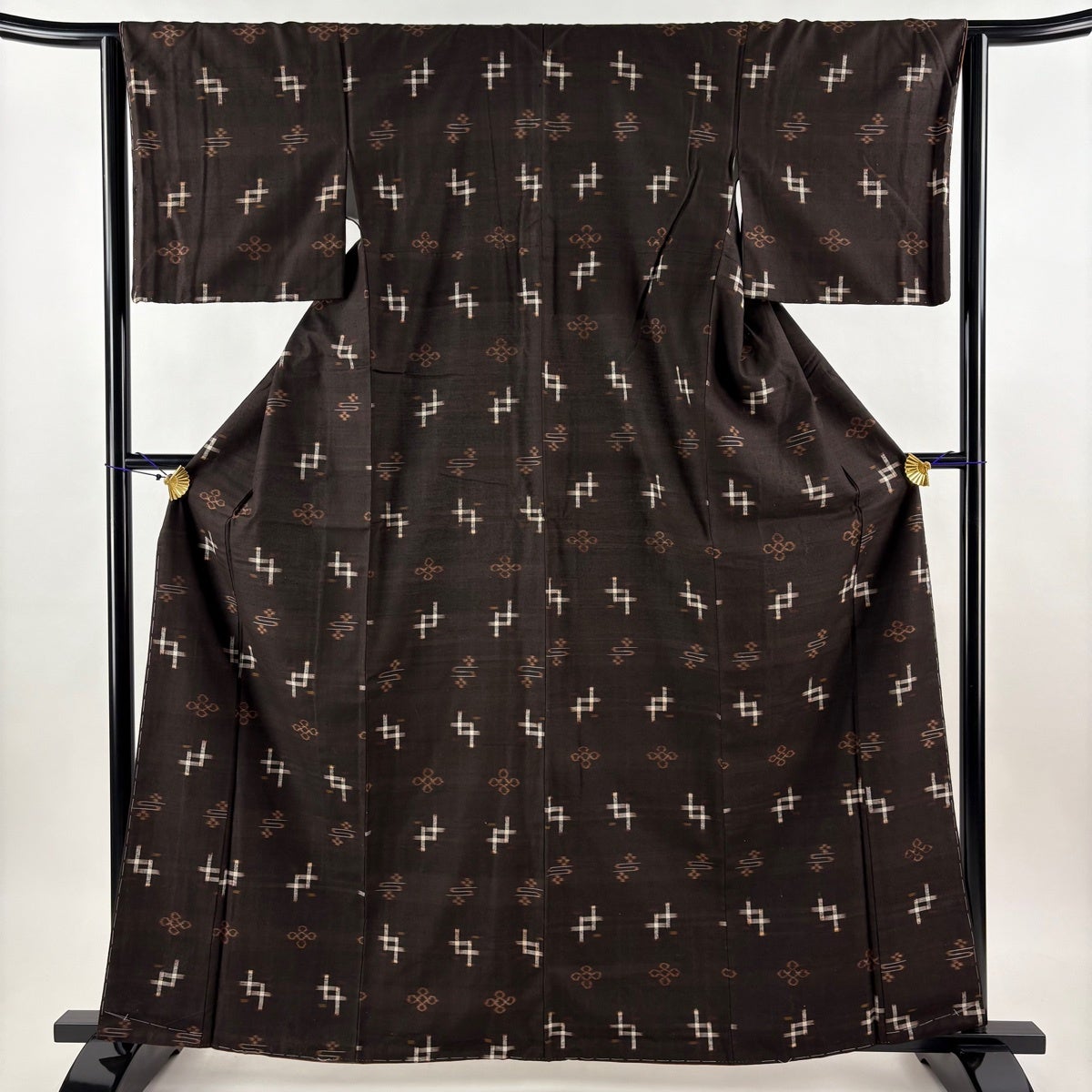 紬 身丈163cm 裄丈63.5cm S 袷 本場久米島紬 幾何学模様 流水 焦茶色 正絹 逸品