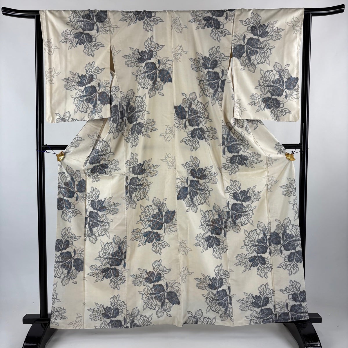 【美品】 小紋 身丈155cm 裄丈66.5cm M 袷 枝葉 ぼかし 灰色 正絹 秀品