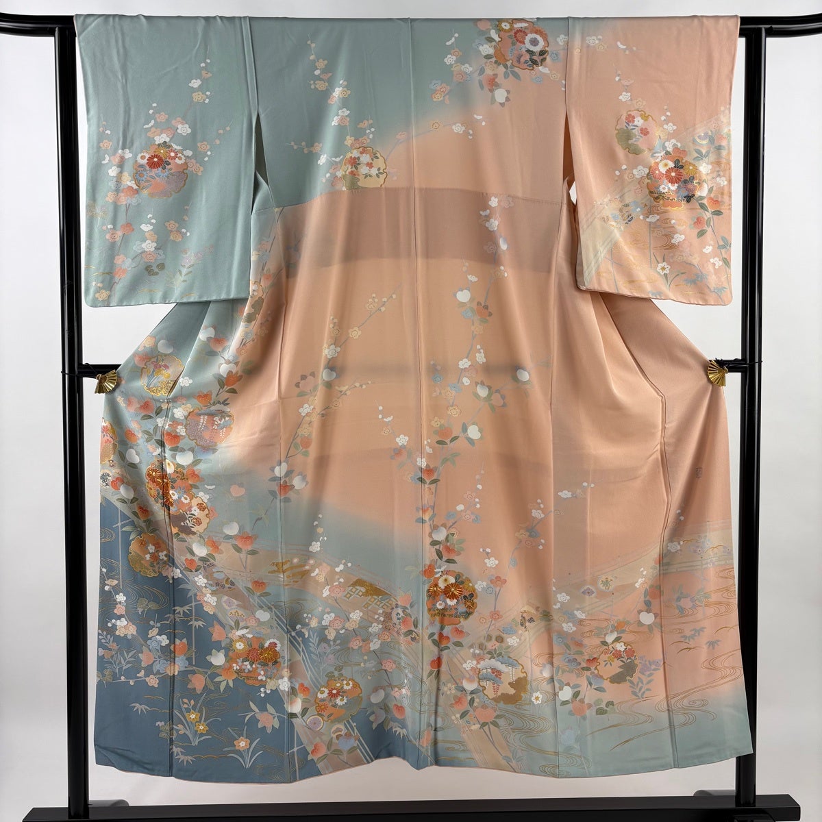 振袖 身丈164cm 裄丈68cm L 袷 松竹梅 菊 金彩 染め分け 緑 正絹 秀品
