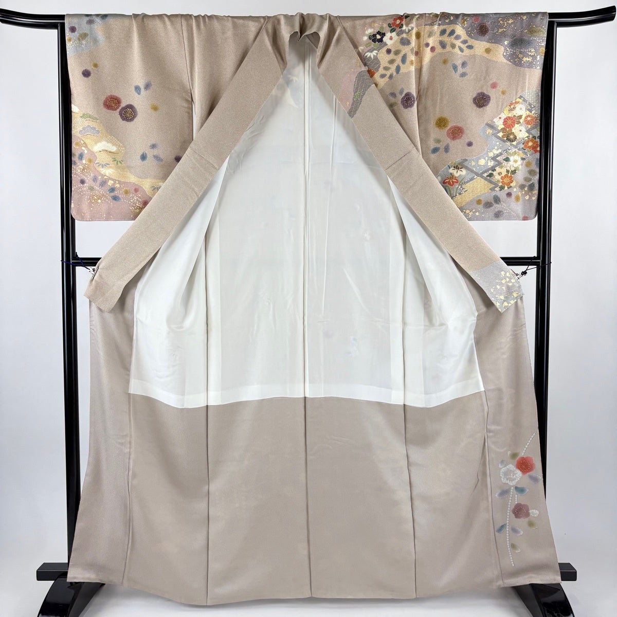 付下げ 身丈158cm 裄丈62cm S 袷 草花 菱 雌雄 ぼかし 灰色 正絹 秀品