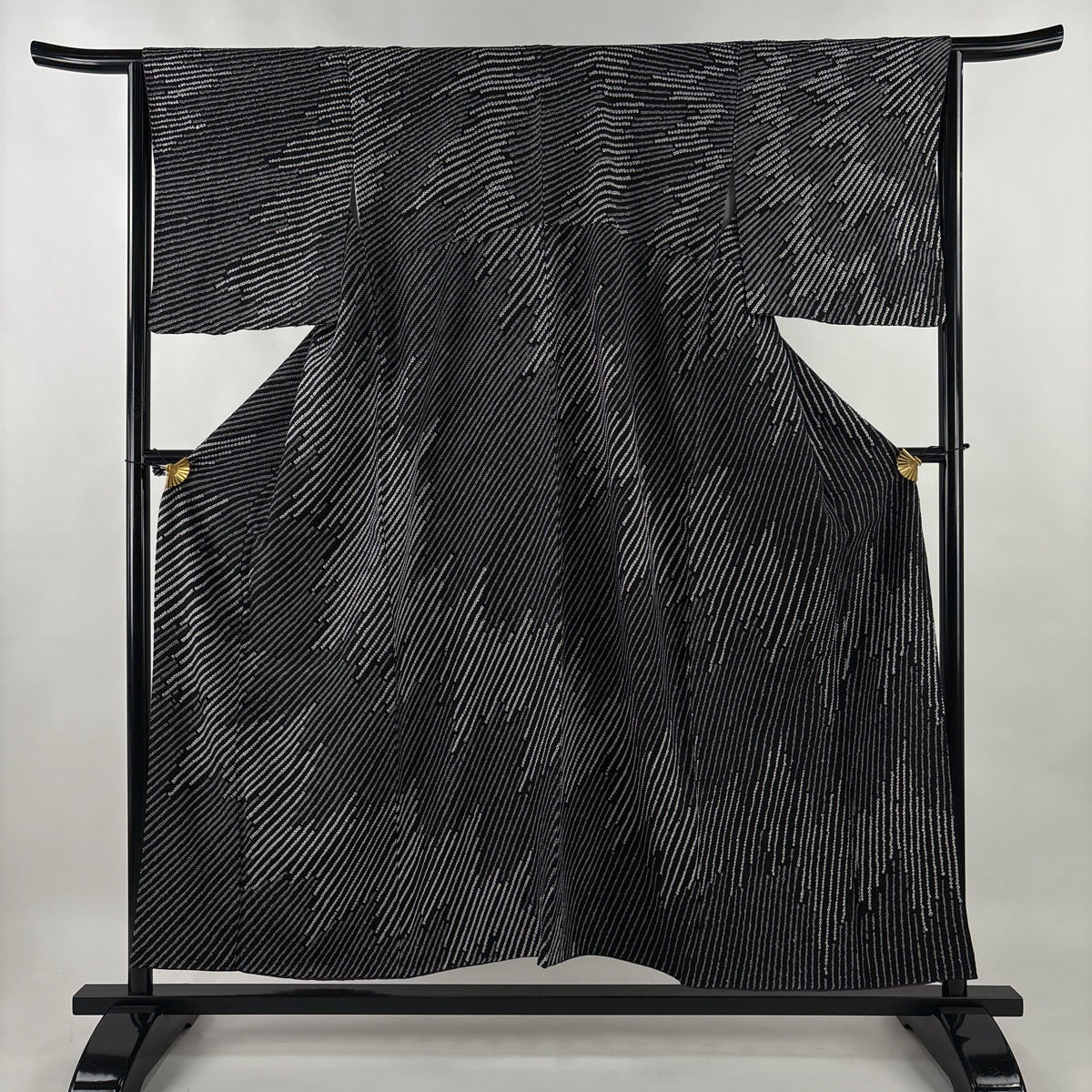 紬 身丈163cm 裄丈65cm M 袷 アンサンブル 幾何学模様 墨色 正絹 逸品