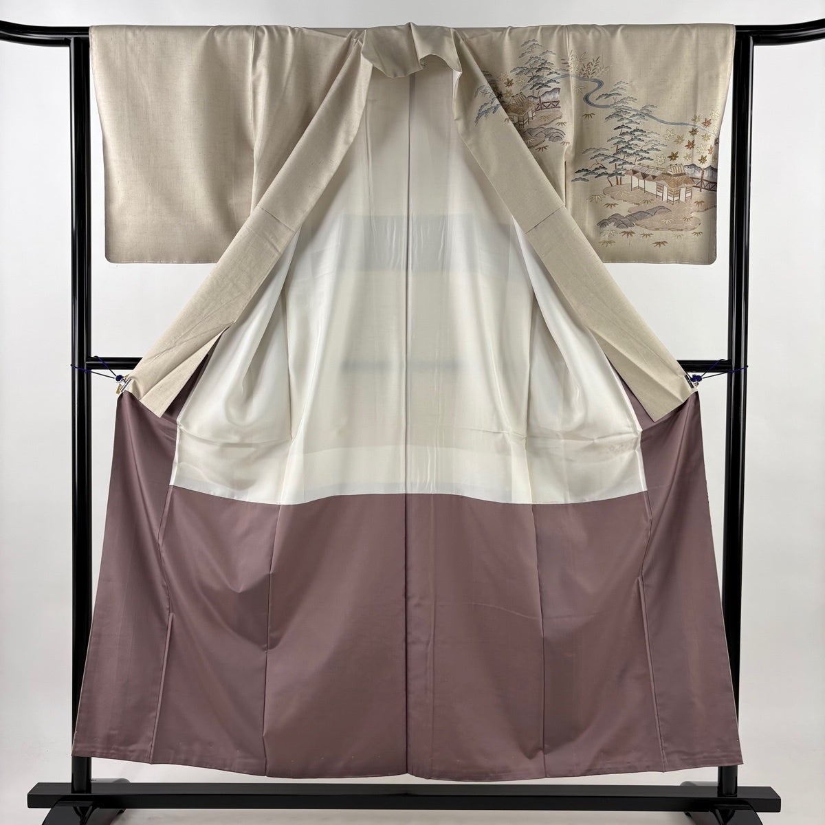 訪問着 身丈163cm 裄丈66cm M 袷 紬地 樹木 霞 絞り 薄茶色 正絹 秀品