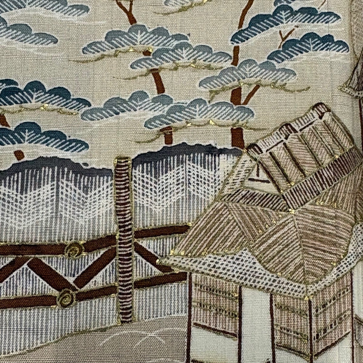 【美品】 紬 身丈156.5cm 裄丈64cm M 袷 建物 樹木 焦茶色 正絹 秀品