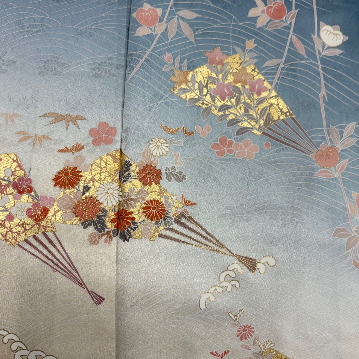 小紋 身丈158cm 裄丈64cm M 袷 鈴乃屋 菊 扇面 金彩 青灰色 正絹 名品