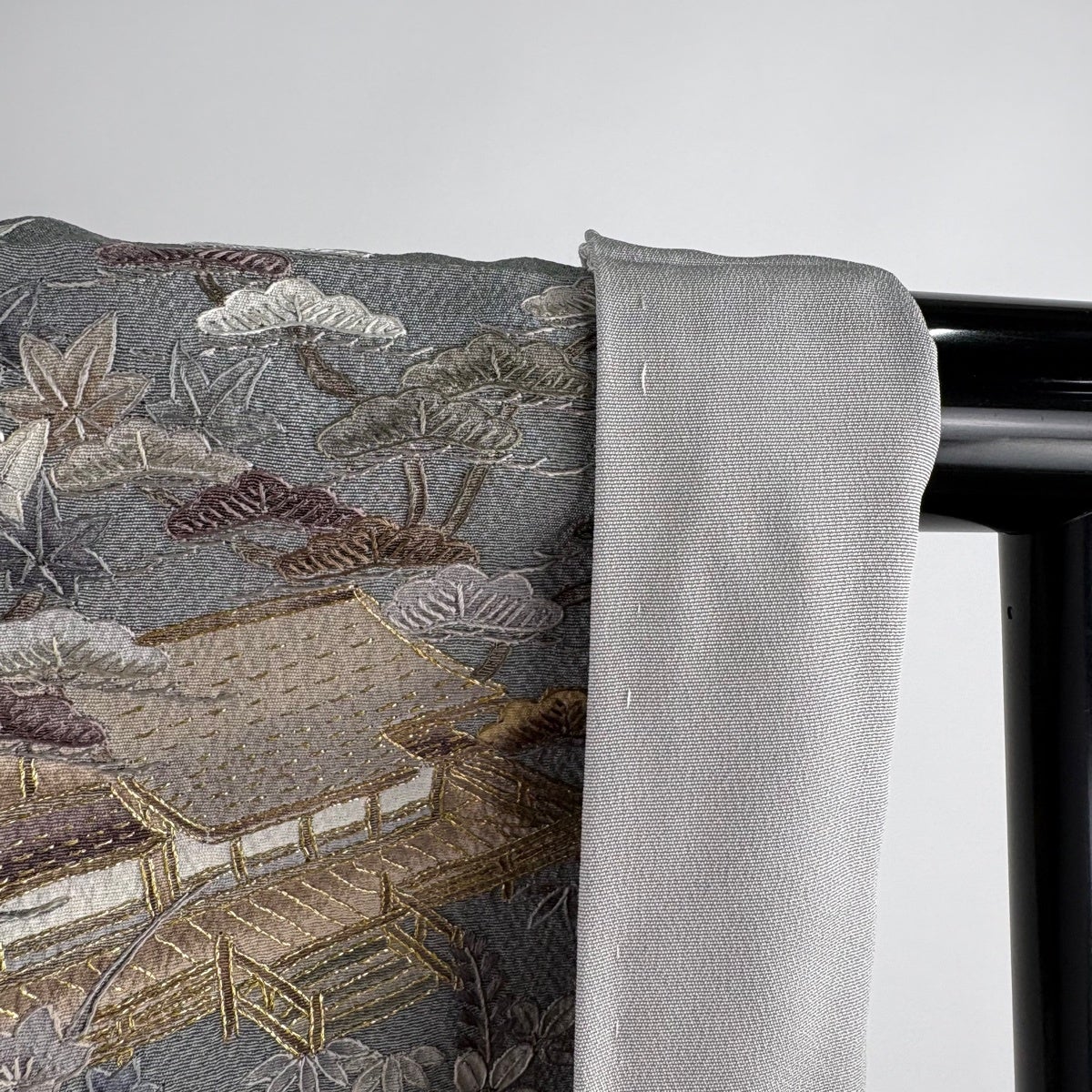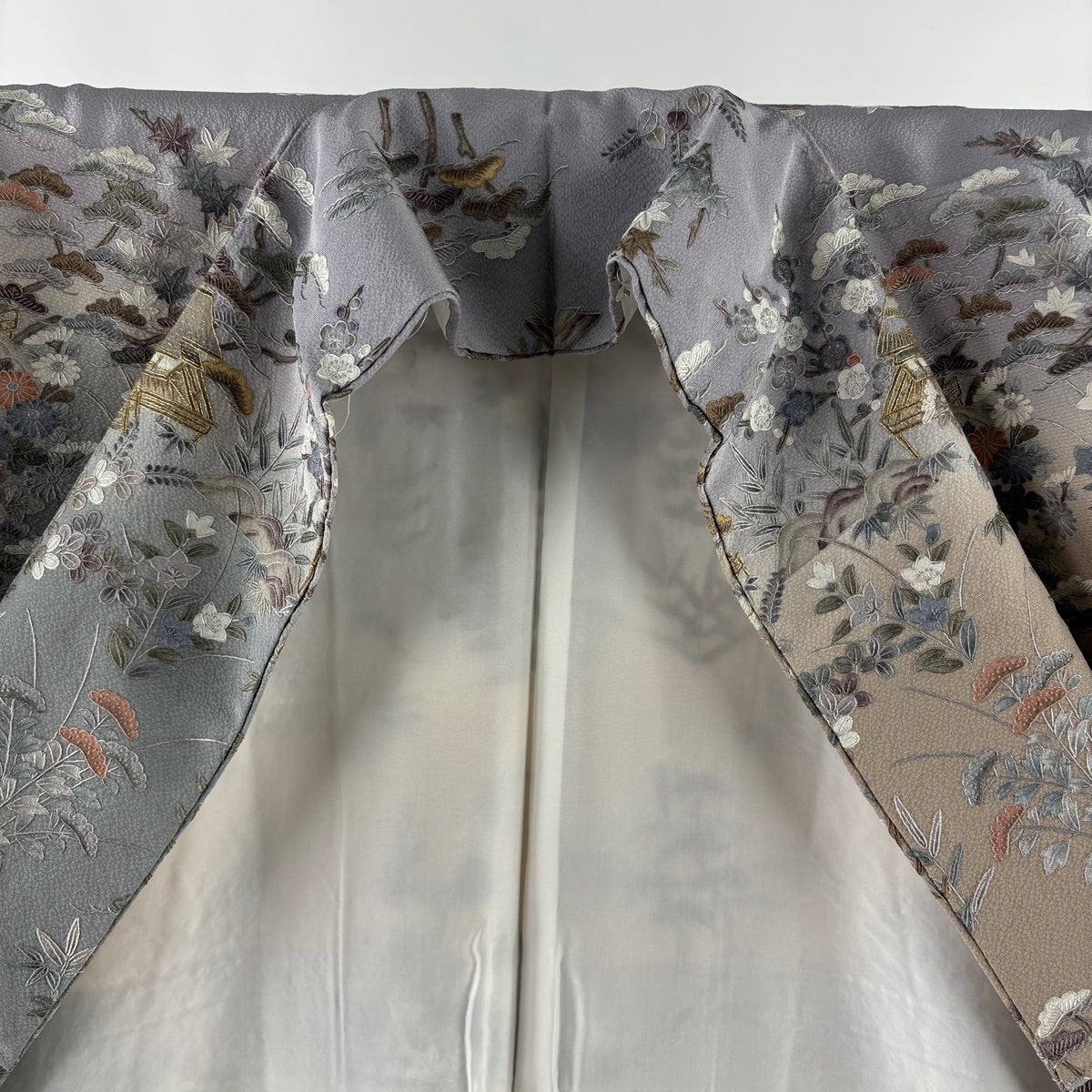 付下げ 身丈160cm 裄丈67.5cm L 袷 草花 刺繍 金銀彩 青灰色 正絹 名品