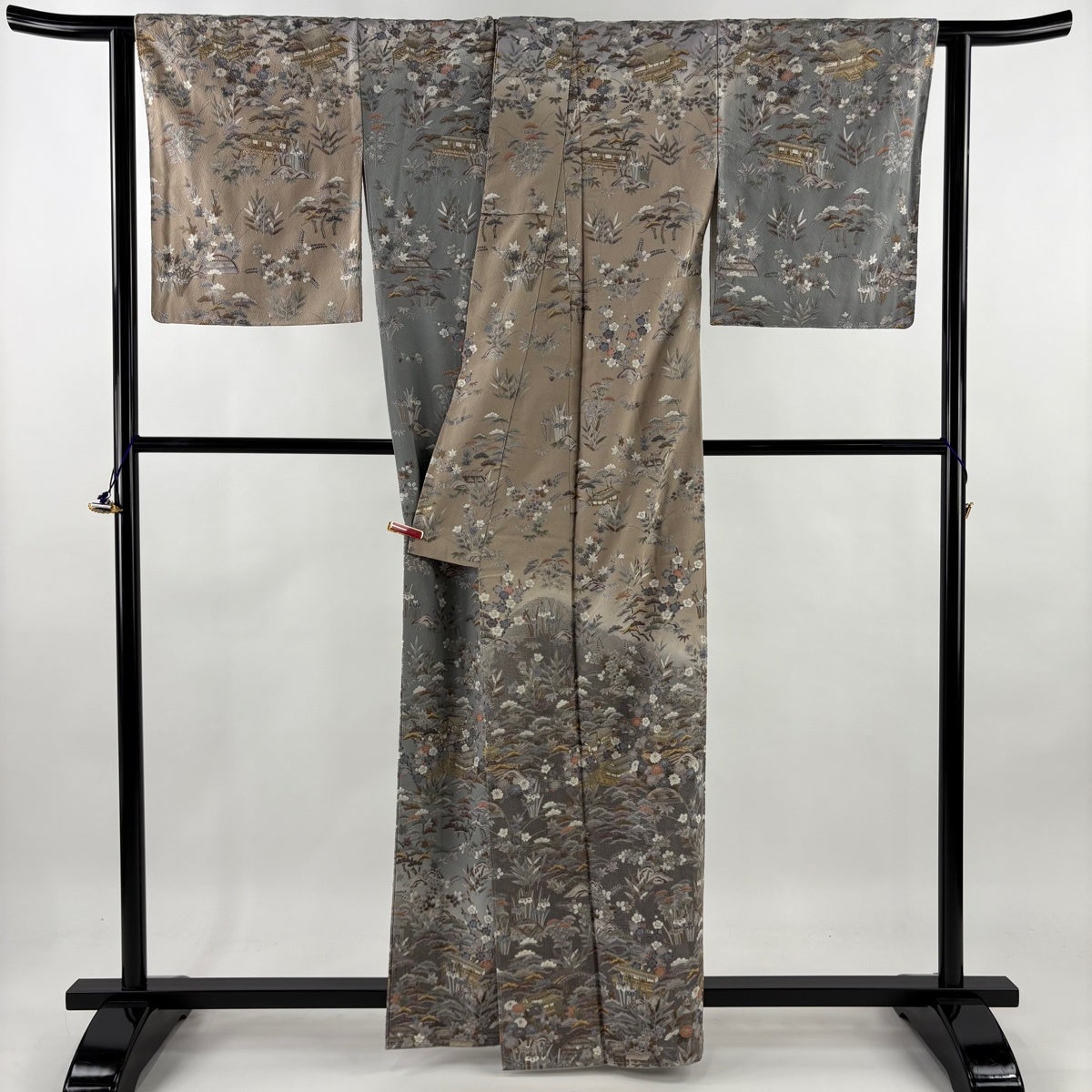 付下げ 身丈152cm 裄丈63cm S 袷 雪輪 草花 金糸 刺繍 灰緑 正絹 秀品