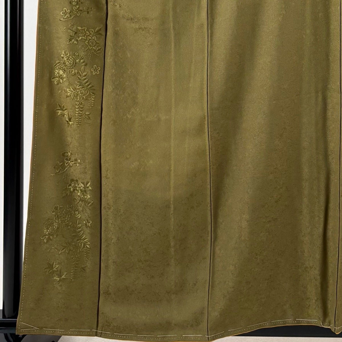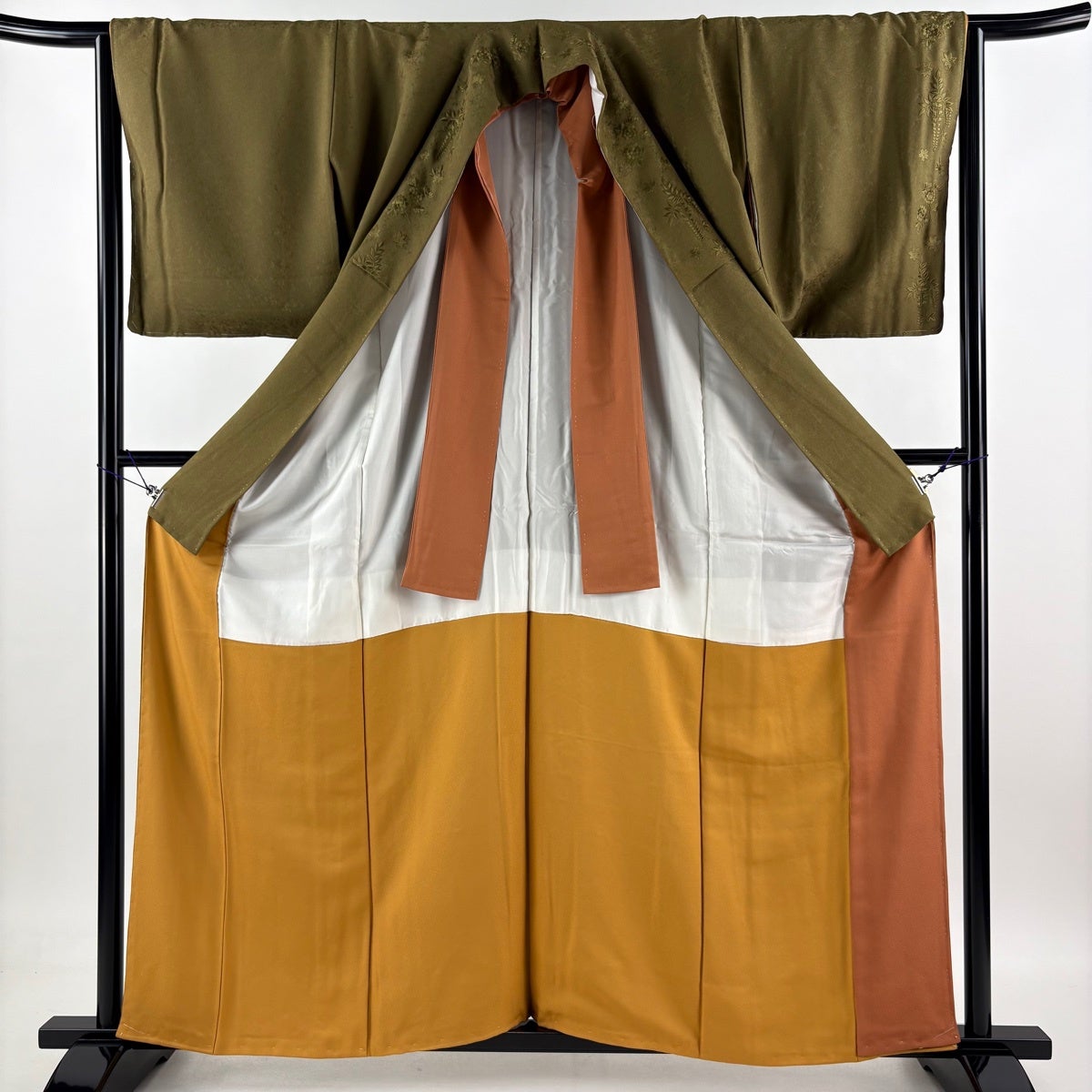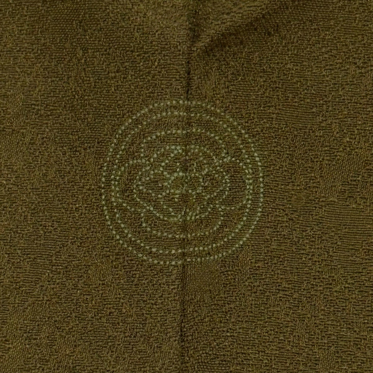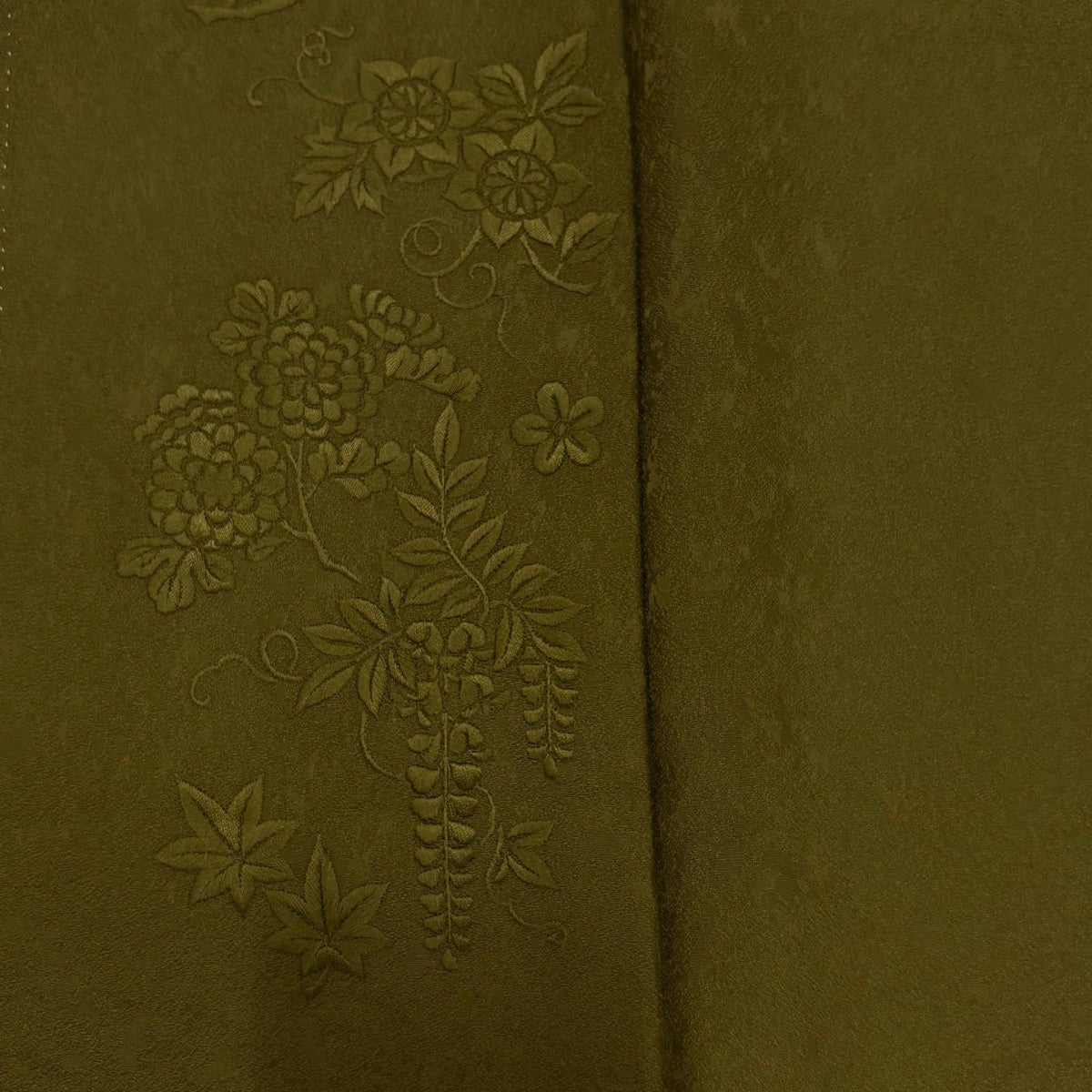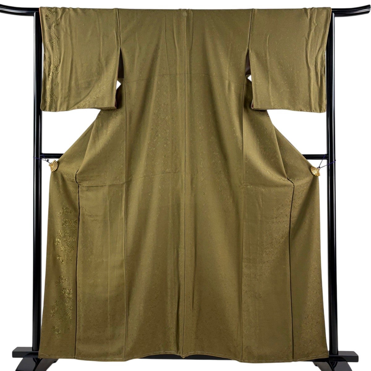 付下げ 身丈160.5cm 裄丈65cm M 袷 藤 菊 刺繍 茶緑色 正絹 秀品 一つ紋