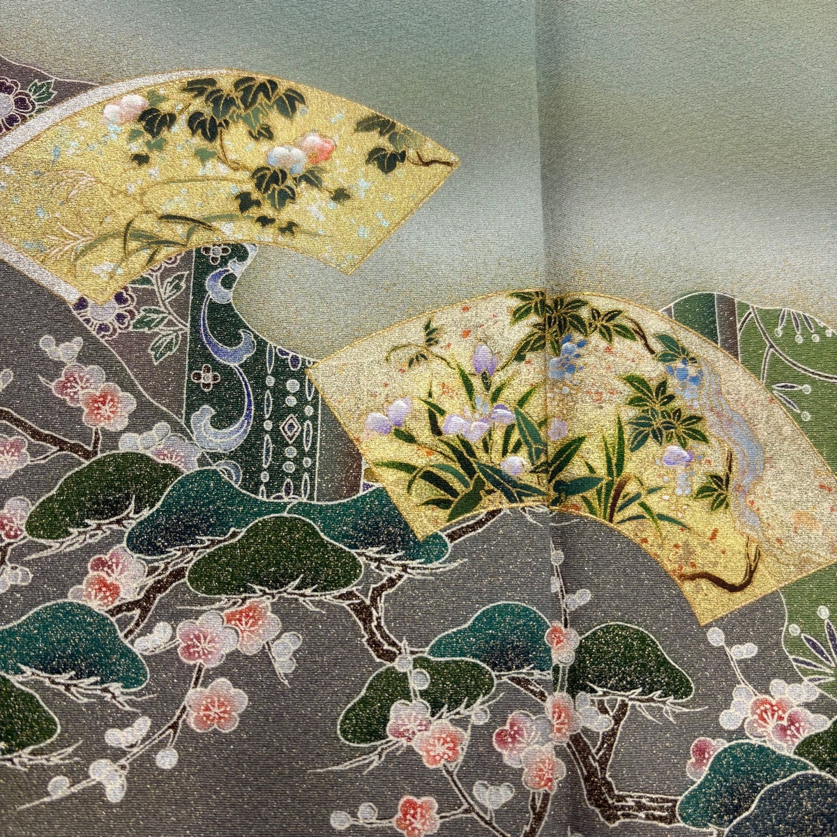 振袖 身丈166cm 裄丈67.5cm L 袷 松竹梅 箔散らし 金彩 灰緑 正絹 秀品