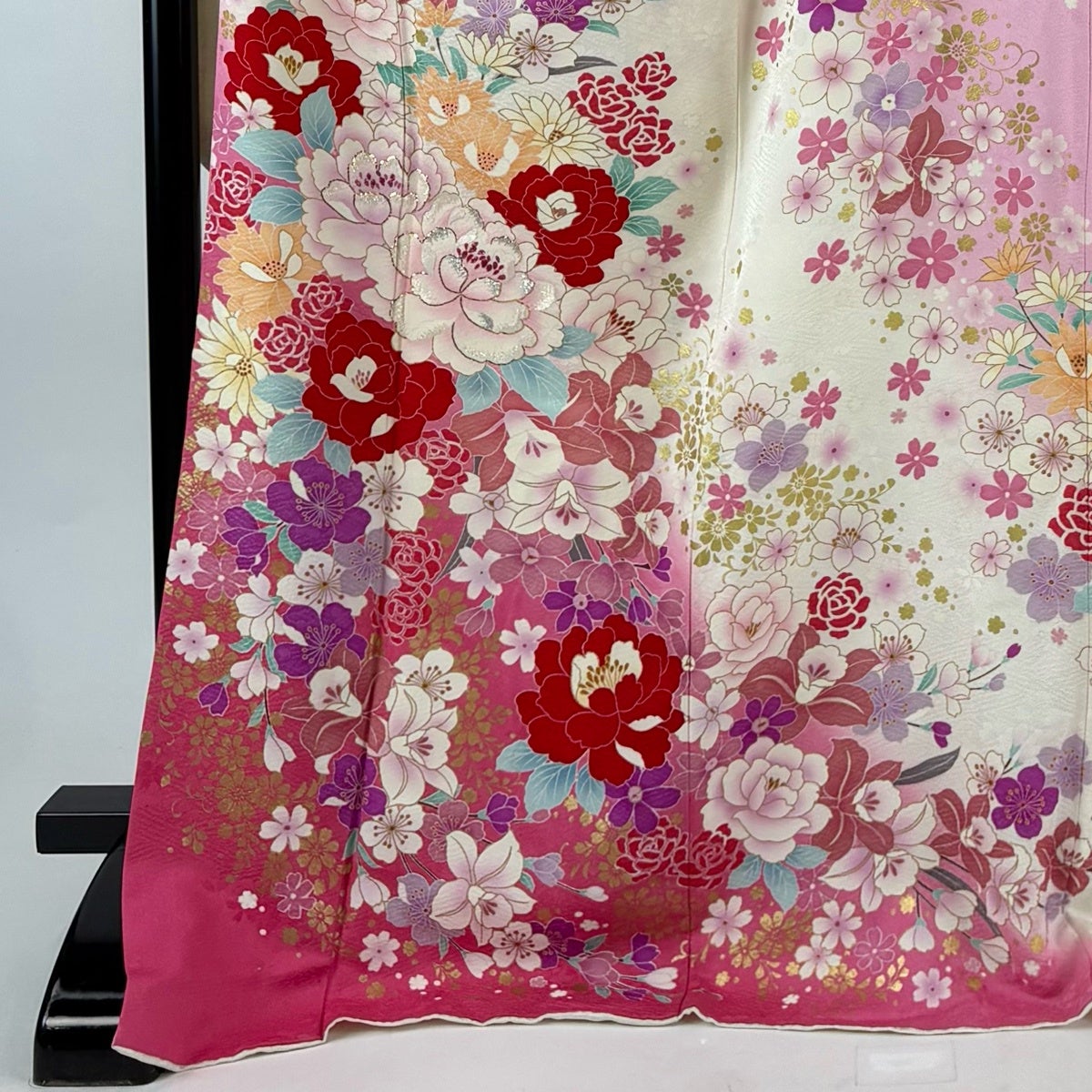 振袖 身丈170.5cm 裄丈70cm L 袷 牡丹 桜 箔 金彩 えんじ色 正絹 秀品