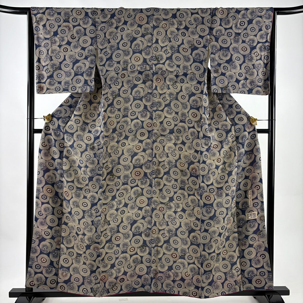 小紋 身丈155.5cm 裄丈62.5cm S 袷 落款あり 菊唐草 花唐草 藍色 正絹 秀品