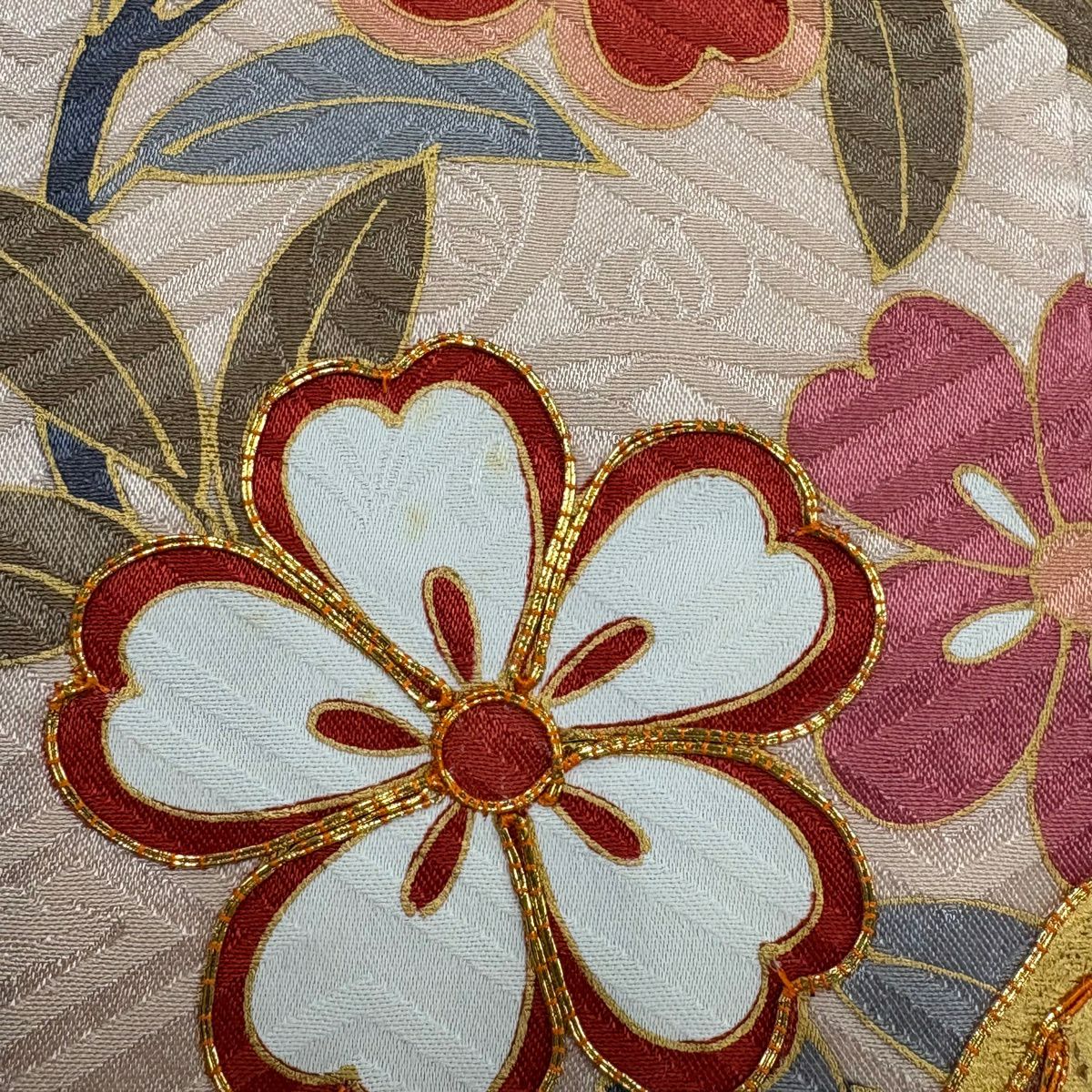 振袖 身丈165.5cm 裄丈66cm M 袷 御所車 草花 金糸 金彩 赤茶 正絹 秀品