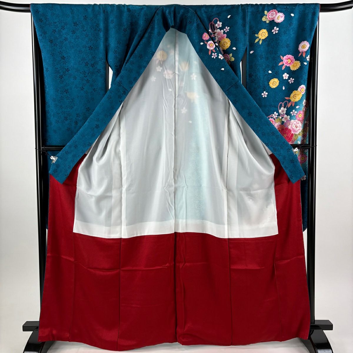 振袖 身丈165cm 裄丈68cm L 袷 草花 花びら 金彩 染め分け 緑 正絹 秀品