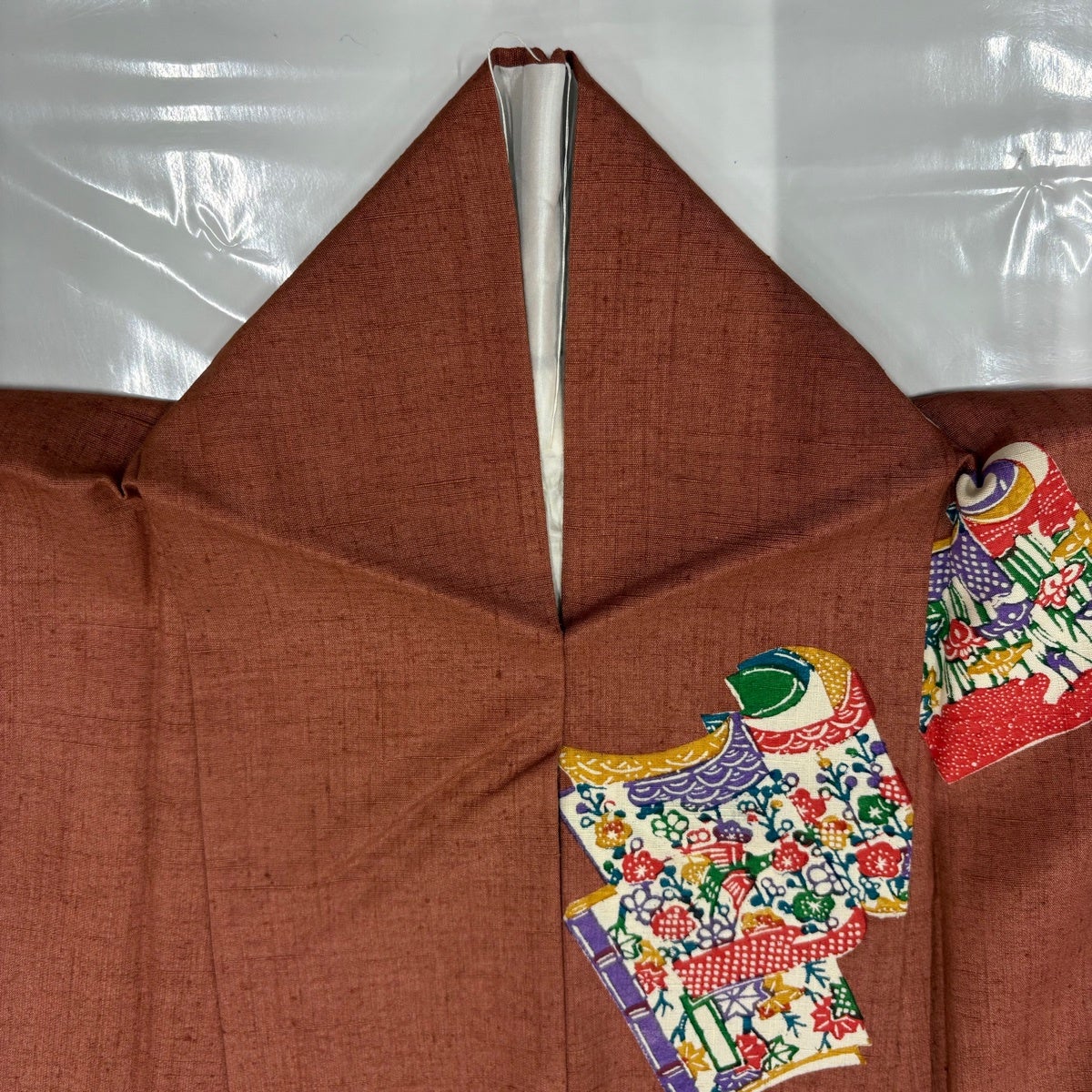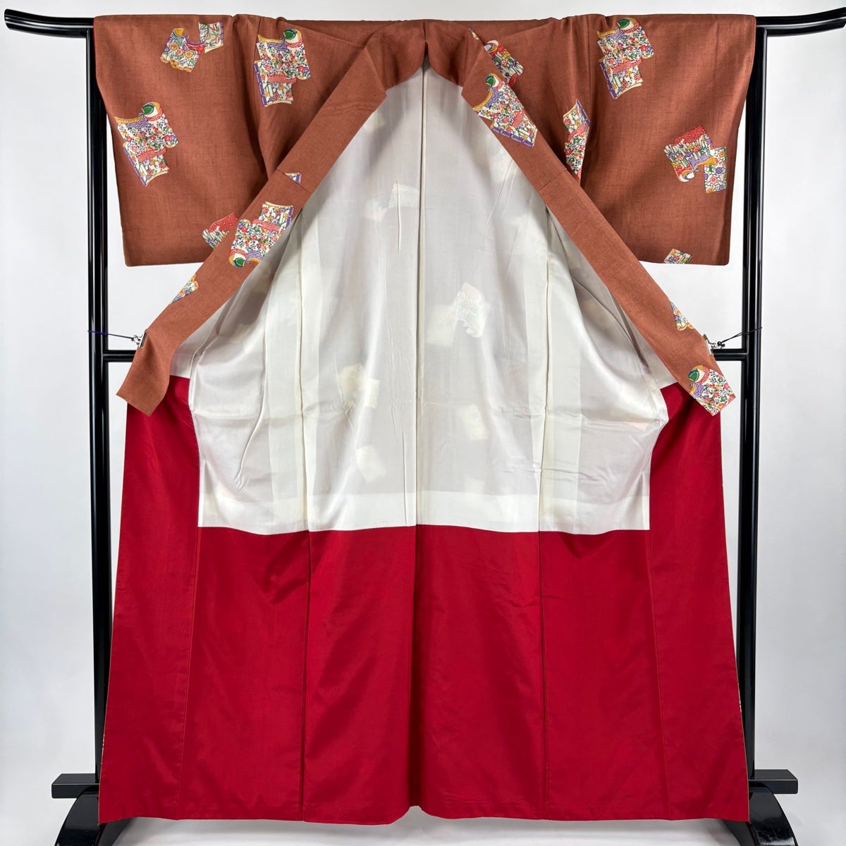 紬 身丈159cm 裄丈64cm M 袷 扇面 草花 焦茶色 正絹 秀品