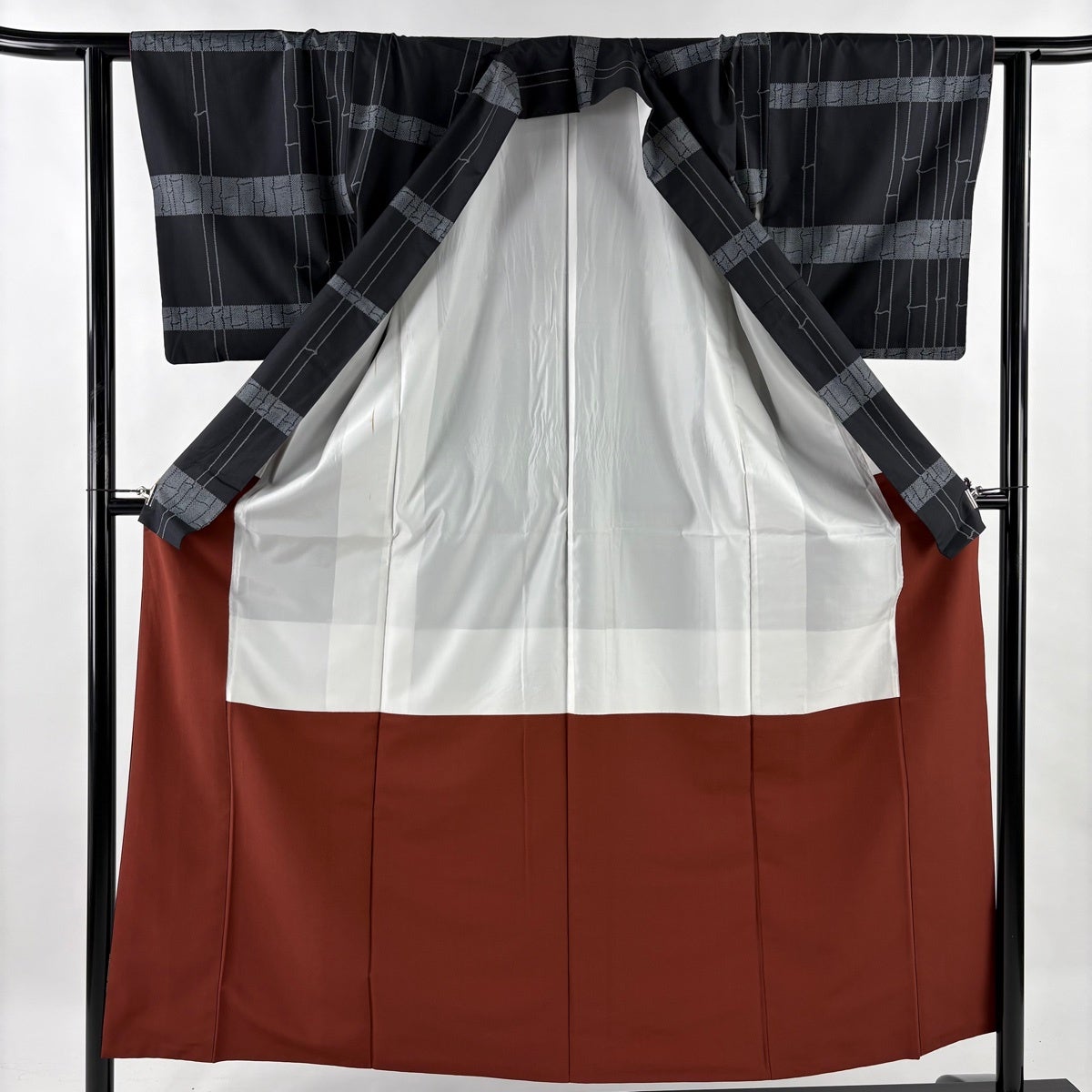 紬 身丈159cm 裄丈63cm S 袷 縞 麻の葉 焦茶色 正絹 秀品