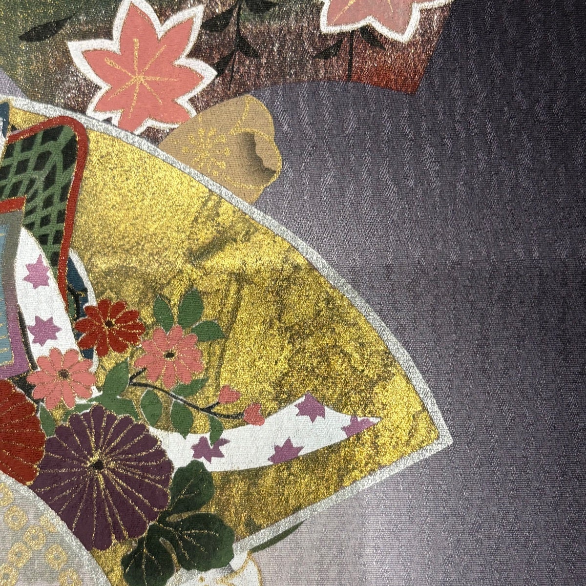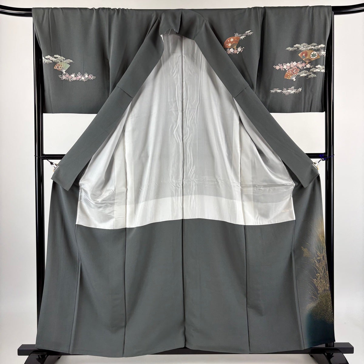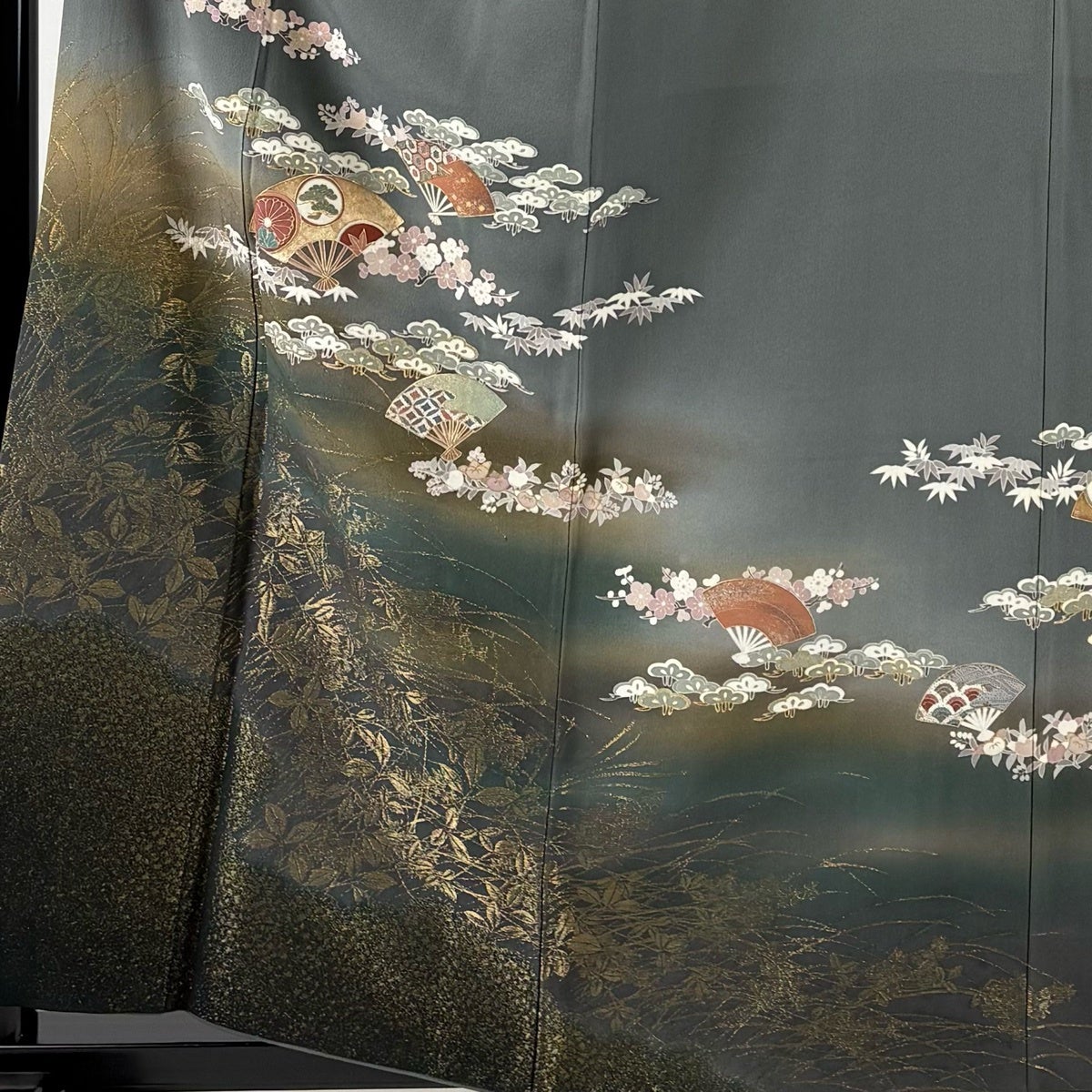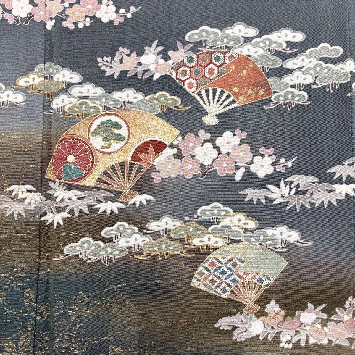 訪問着 身丈158cm 裄丈67.5cm L 袷 扇 松竹梅 金糸 ぼかし 灰緑 正絹 秀品