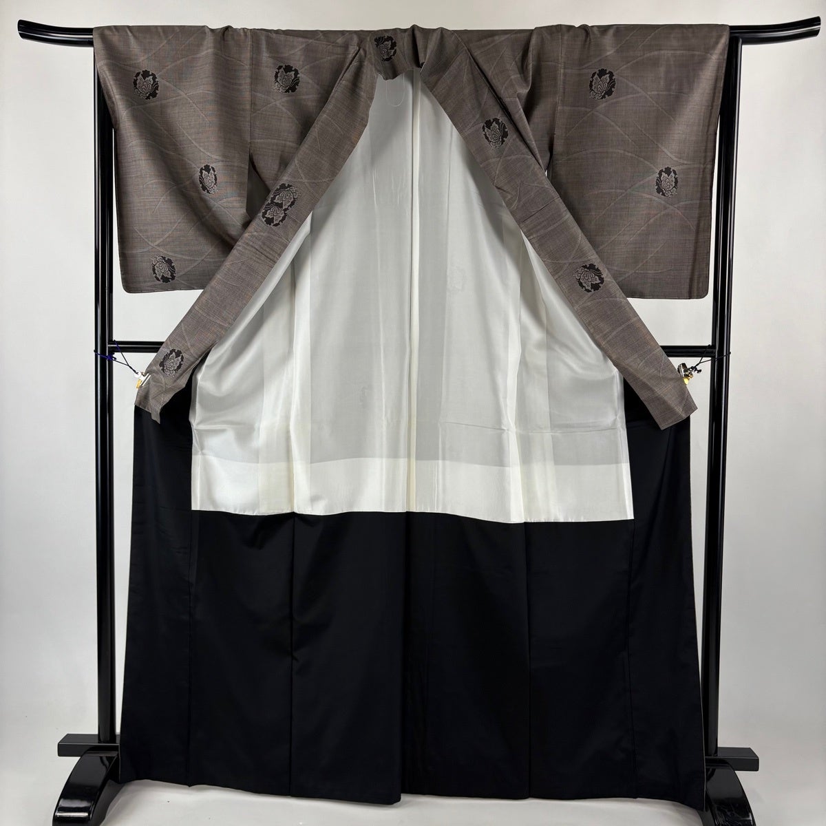 紬 身丈158cm 裄丈64cm M 袷 華文 斜め格子 黒灰 正絹 優品