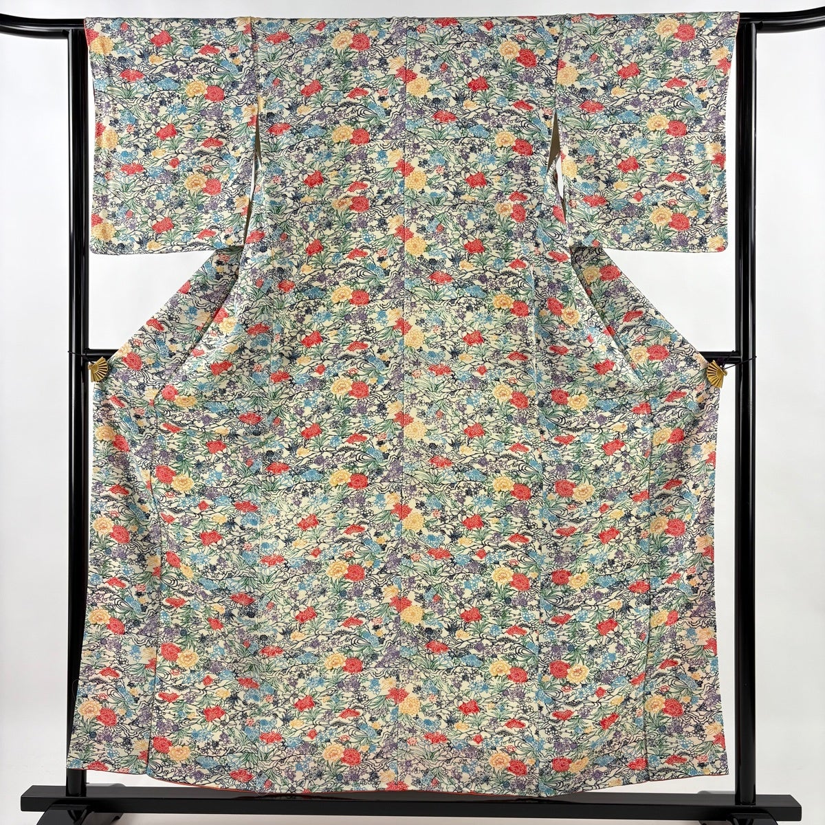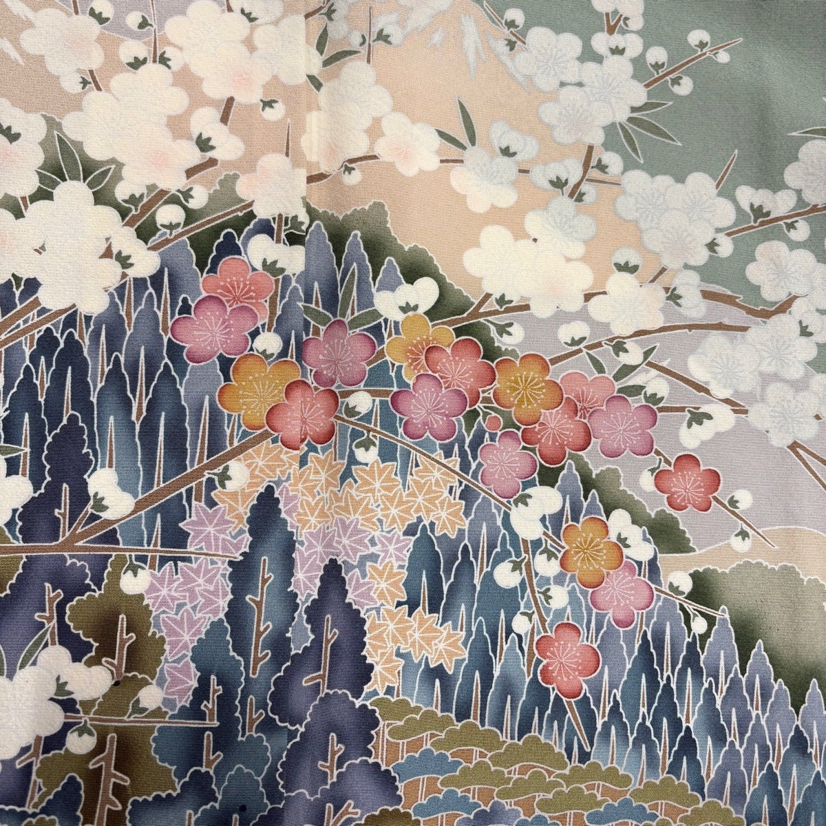 小紋 身丈160cm 裄丈62.5cm S 袷 菊 梅 灰緑 正絹 秀品