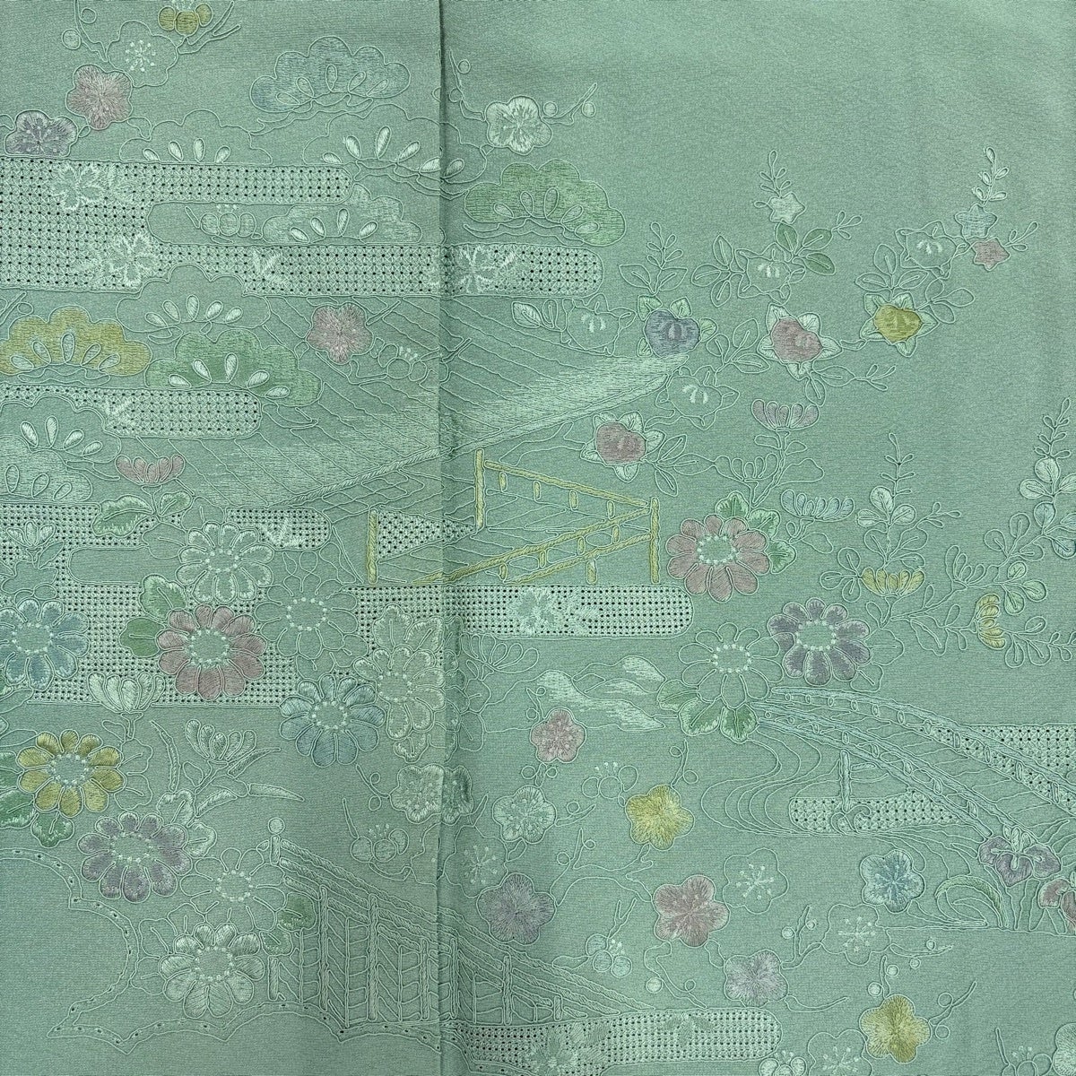 小紋 身丈161.5cm 裄丈64cm M 袷 総絞り 薄緑 正絹 秀品