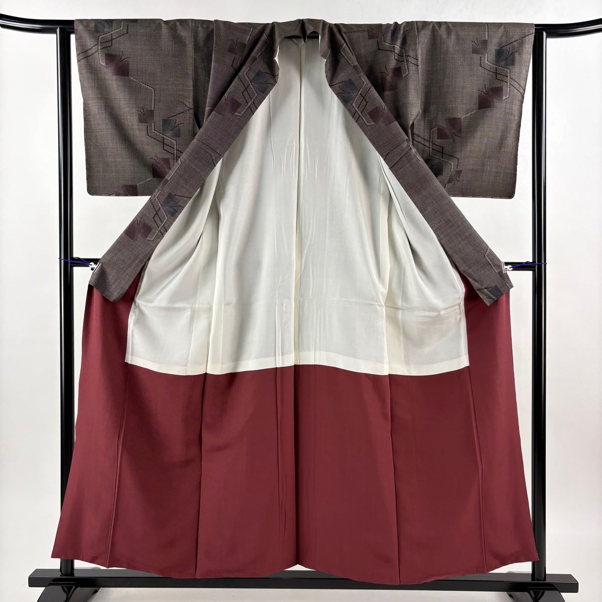 紬 身丈165cm 裄丈64cm M 袷 幾何学模様 焦茶色 正絹 秀品