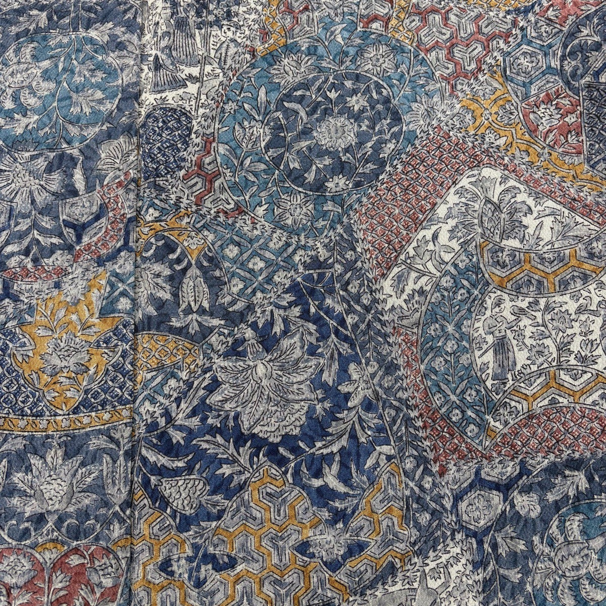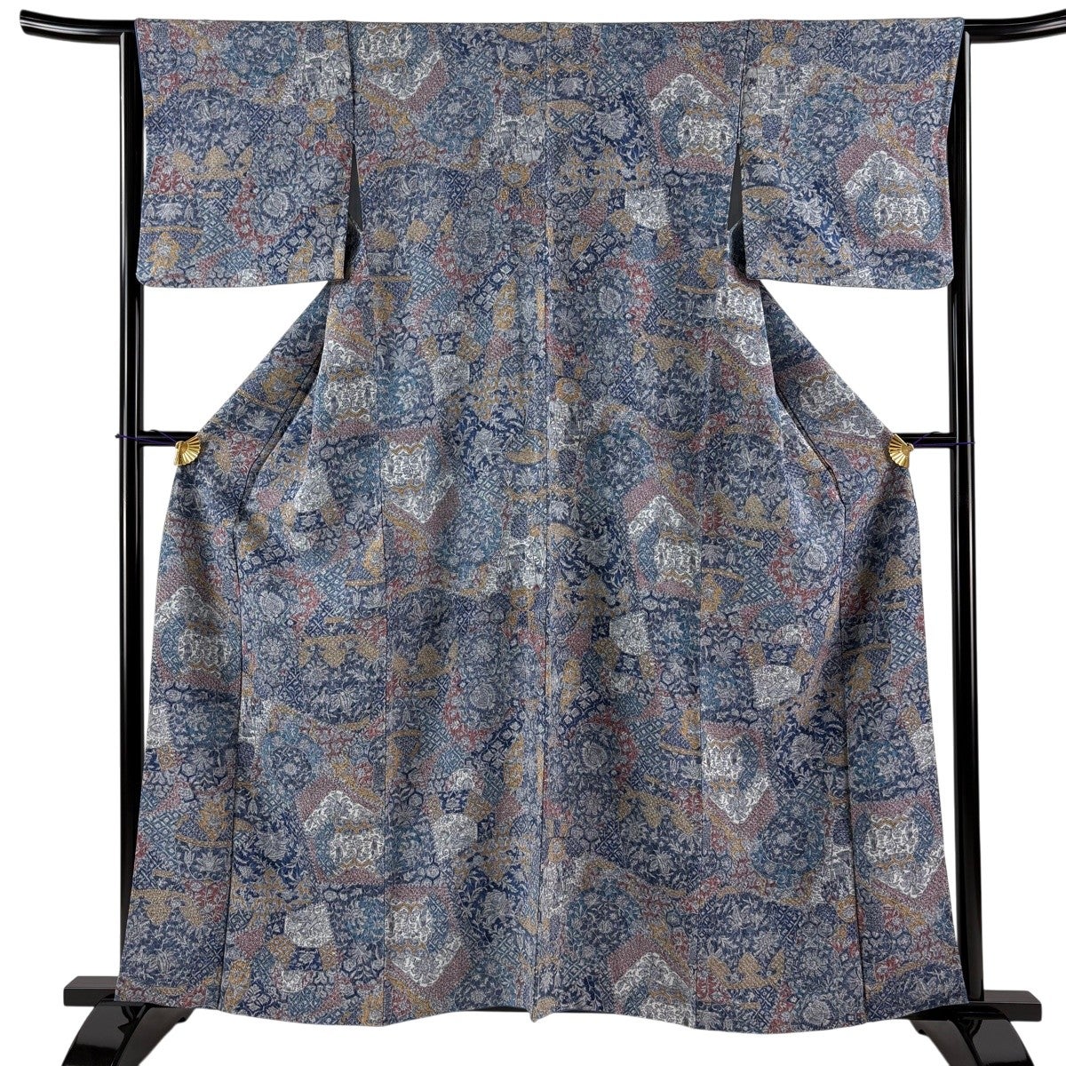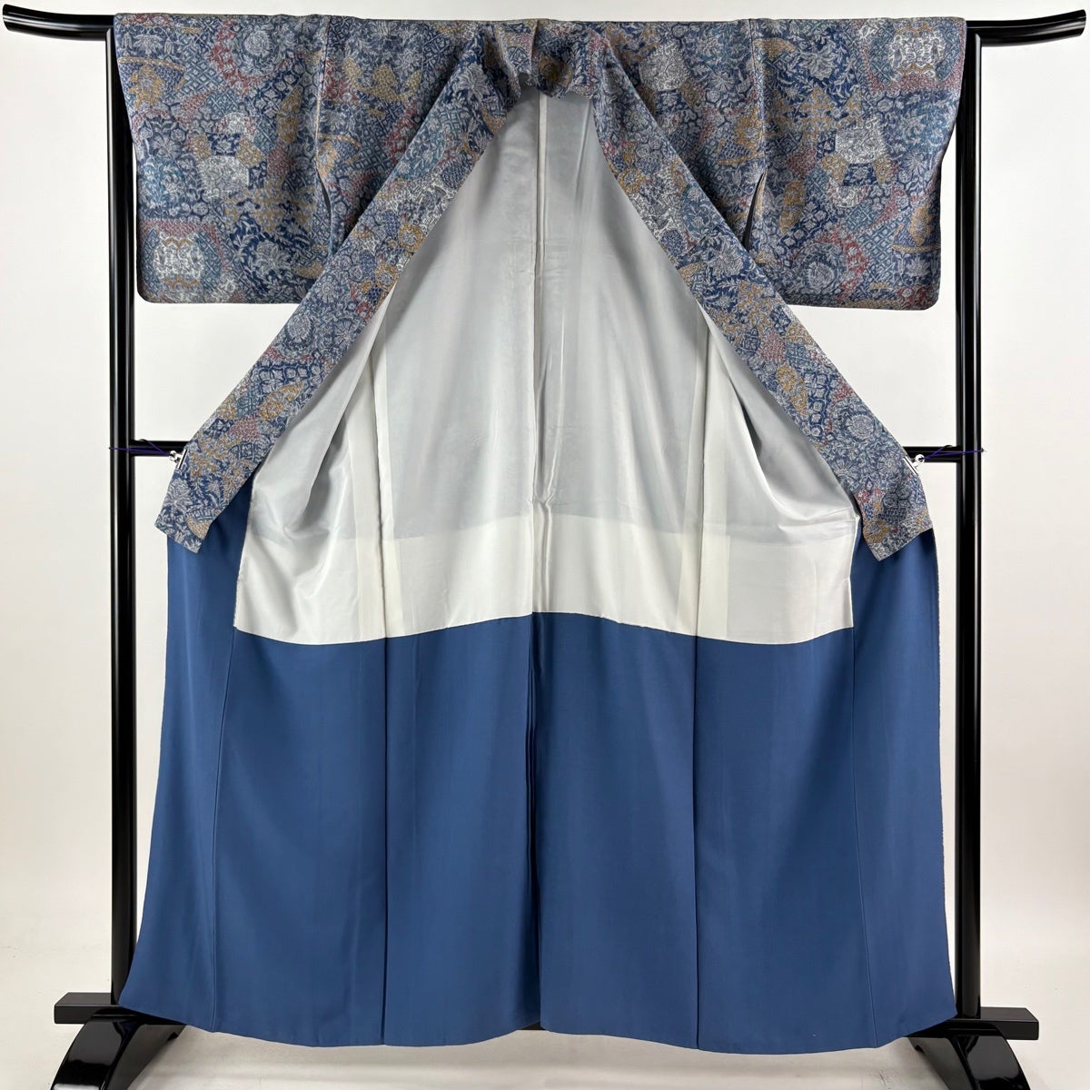 小紋 身丈159.5cm 裄丈65.5cm M 袷 花鳥 人物 縮緬 藍色 正絹 優品